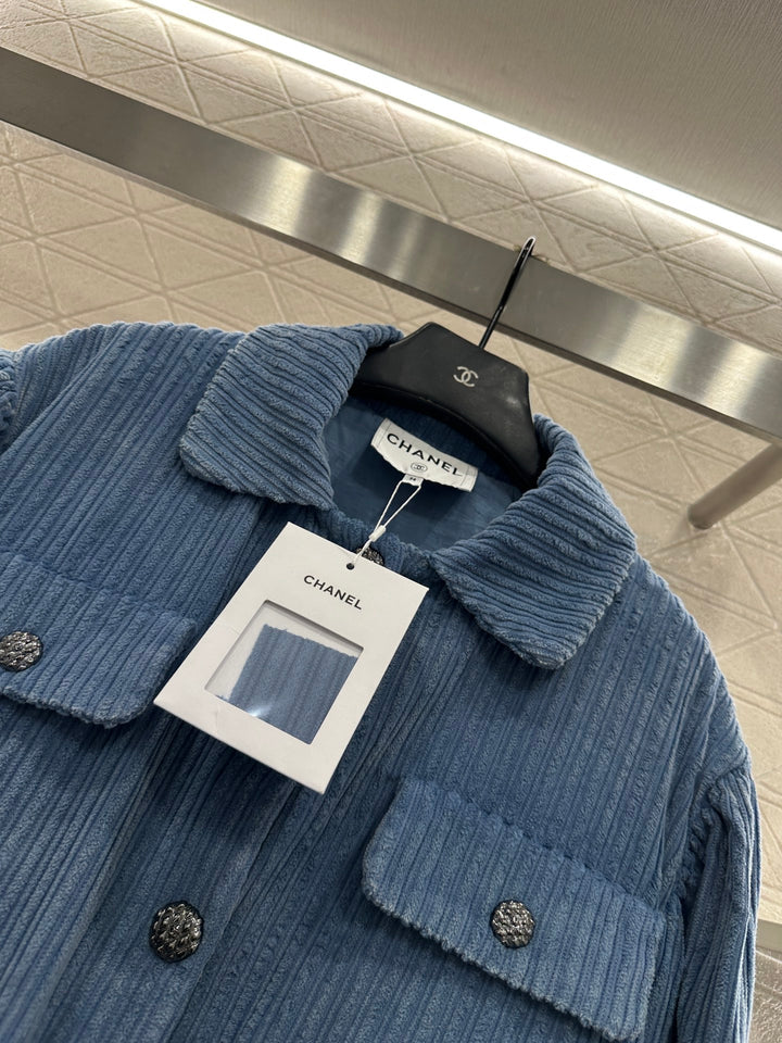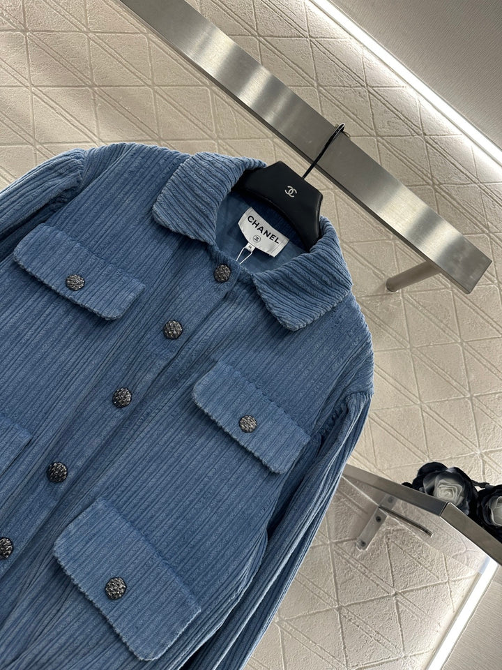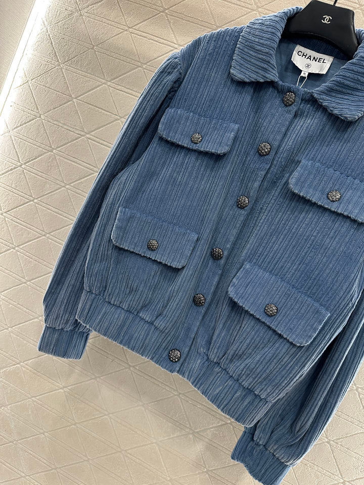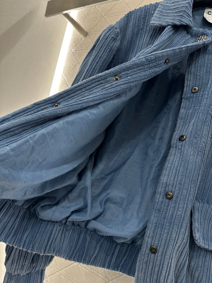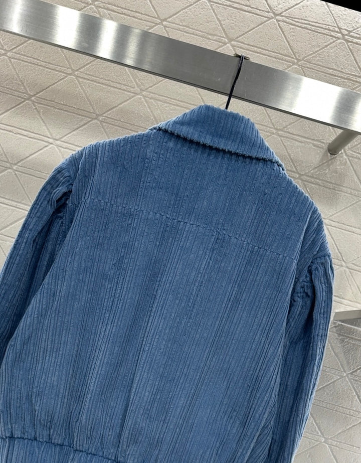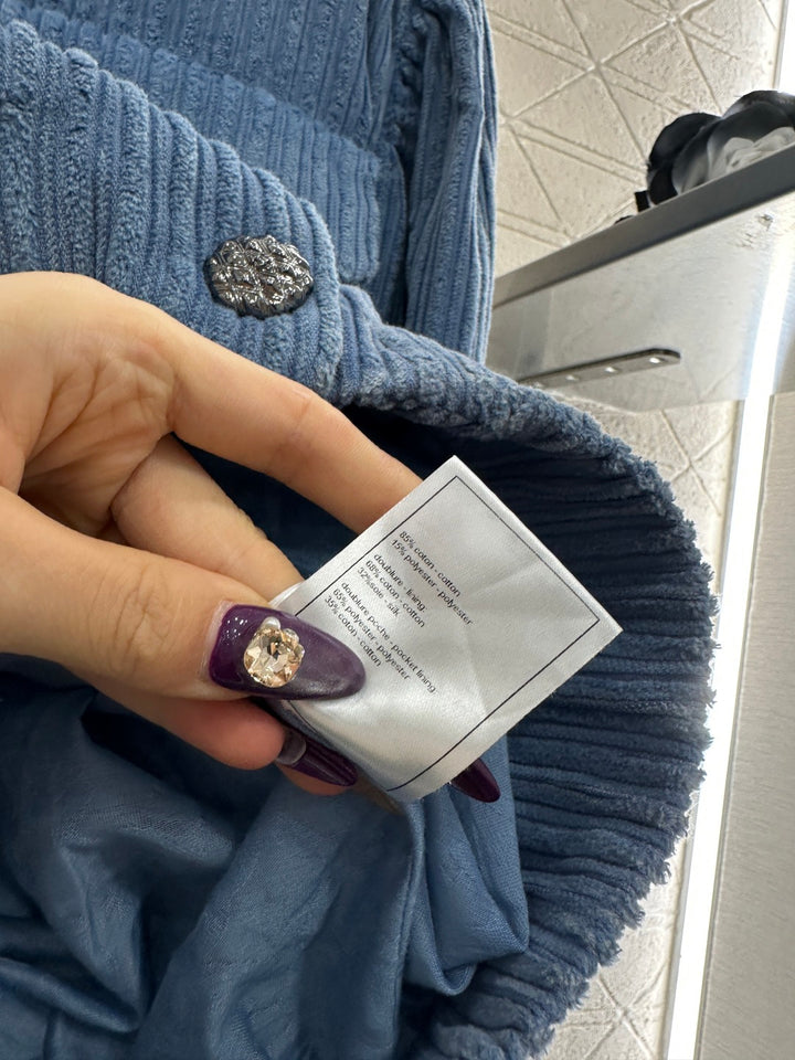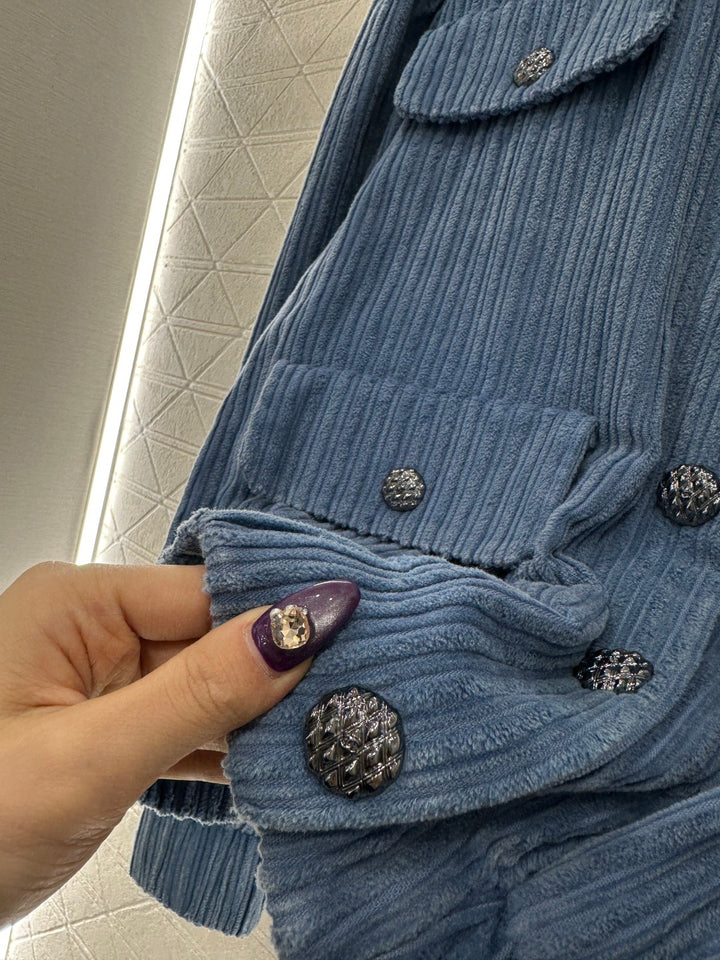 Made of all cotton corduroy material, it has a delicate texture and is crisp and stylish. The lapel jacket has a unique silhouette, and the hem is elastic and narrow, providing excellent wind and cold resistance. The finished garment corduroy has a vertical groove texture, and multiple flip pockets on both sides are practical and warm. The layers are rich, adding visual highlights to the regular style. Paired with diamond pattern cross printed round button decoration, it creates a cold and artistic style, and the upper body shows a high street fashion style.