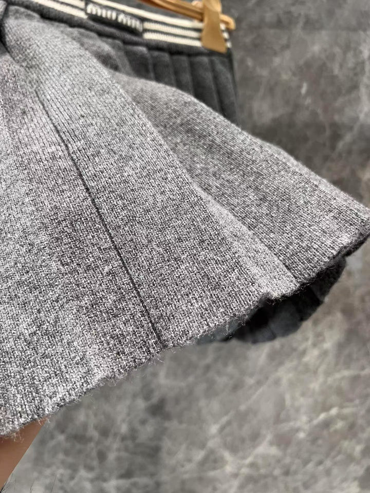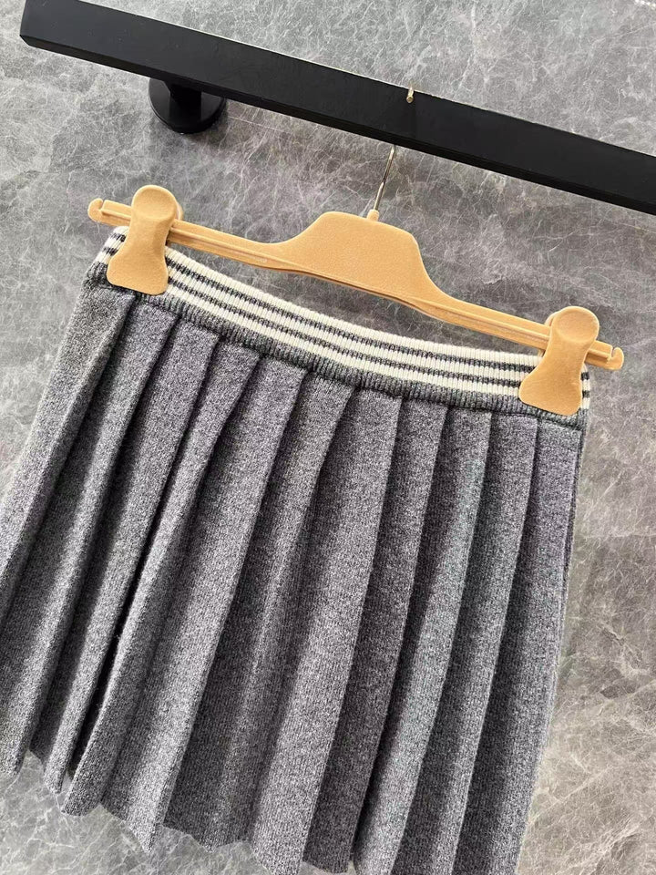 Kostüm mit kontrastfarbenen Streifen und gesticktem Logo im Faltenrock