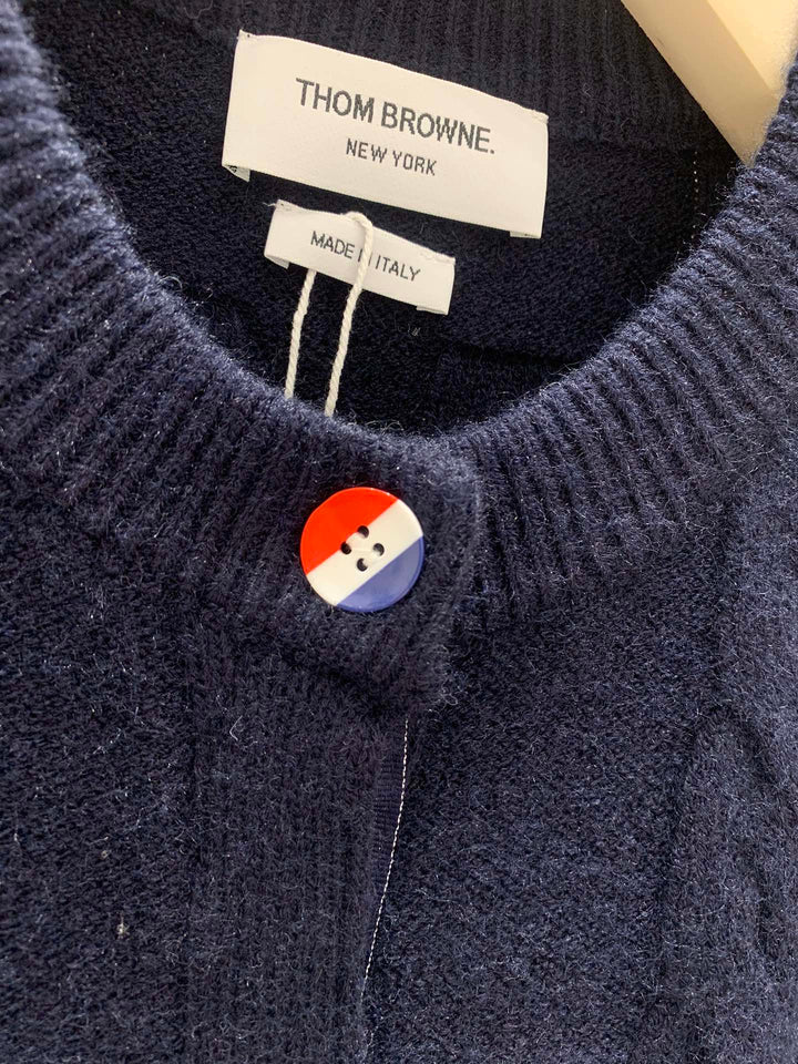 Strickcardigan mit Rundhalsausschnitt in Kontrastfarbe 🆕 Kontrastfarbenes Streifenmuster Zwei Taschen mit Logoknöpfen Bündchen und Kragen mit Ziernähten Modisch und vielseitig Größe S/M