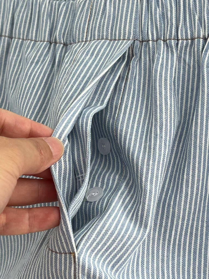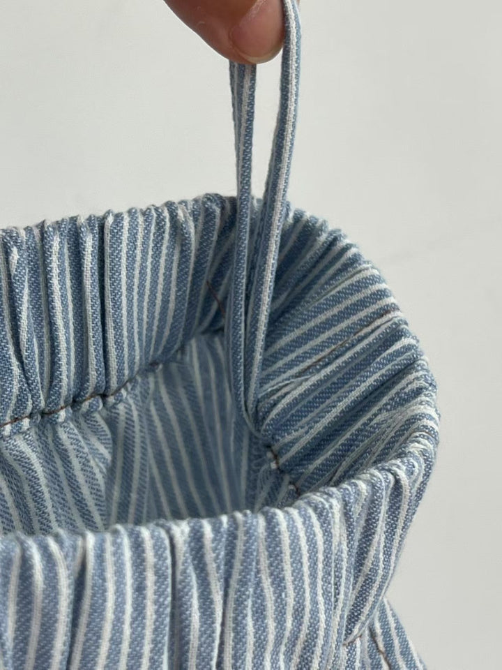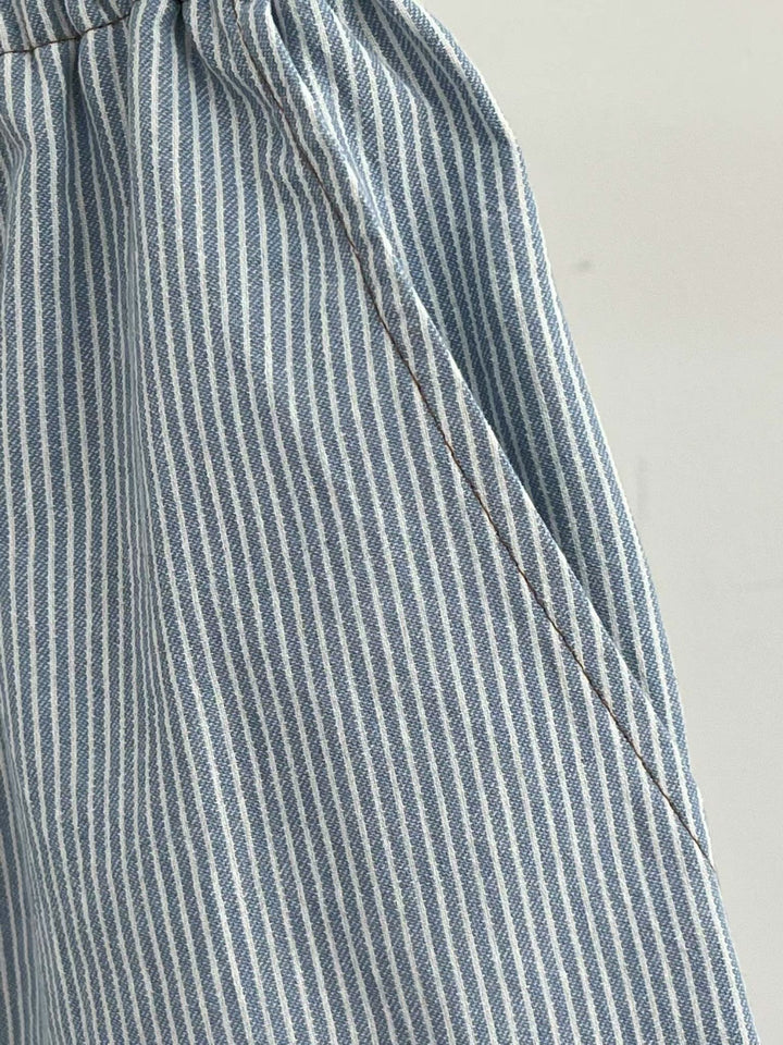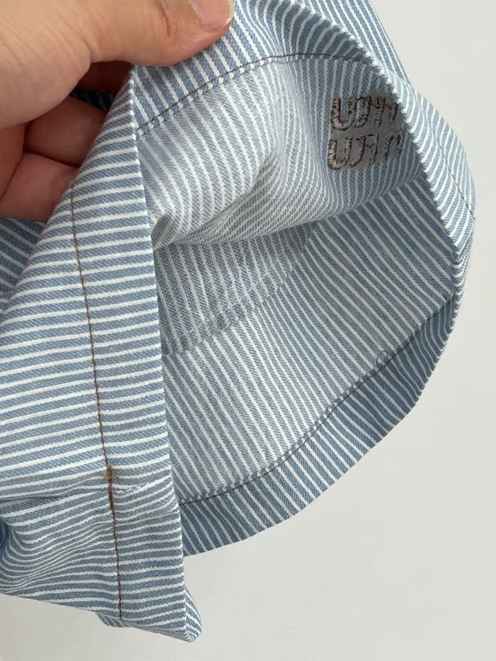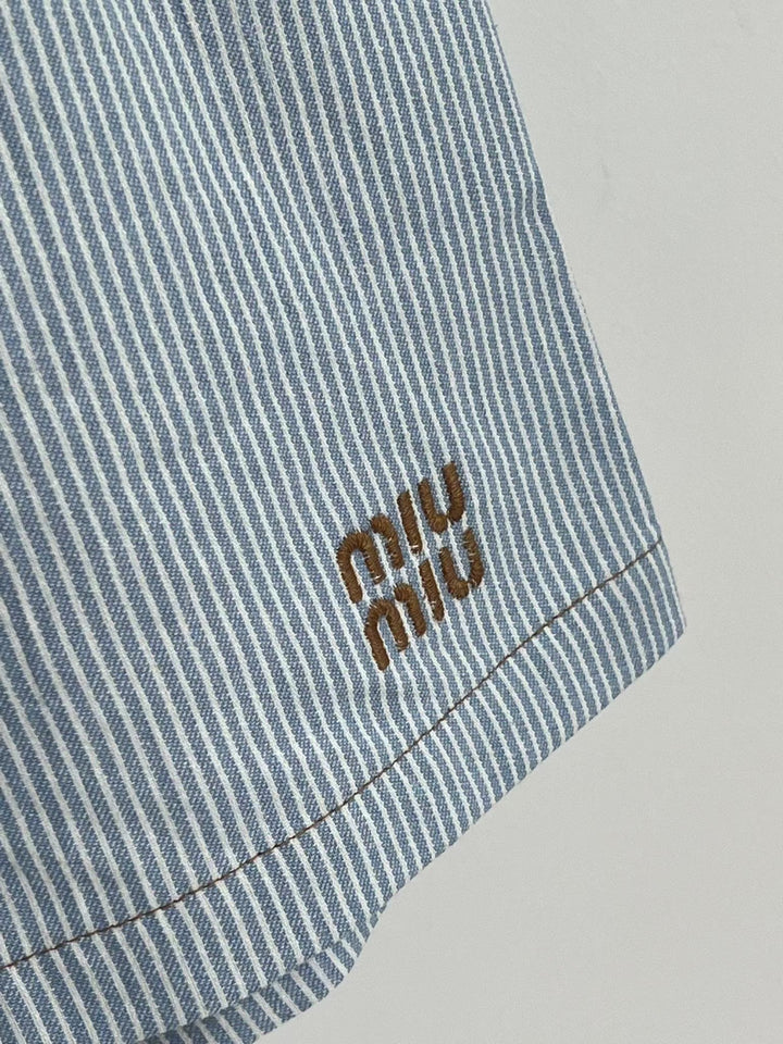 Hellfarbiger, gestreifter Denim, der durch ein spezielles Bleichverfahren entsteht, interpretiert Miu Miu neu und verleiht diesem Kleidungsstück einen Vintage-Look, der an die Retro-Ästhetik des Sommers erinnert.