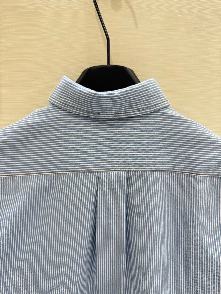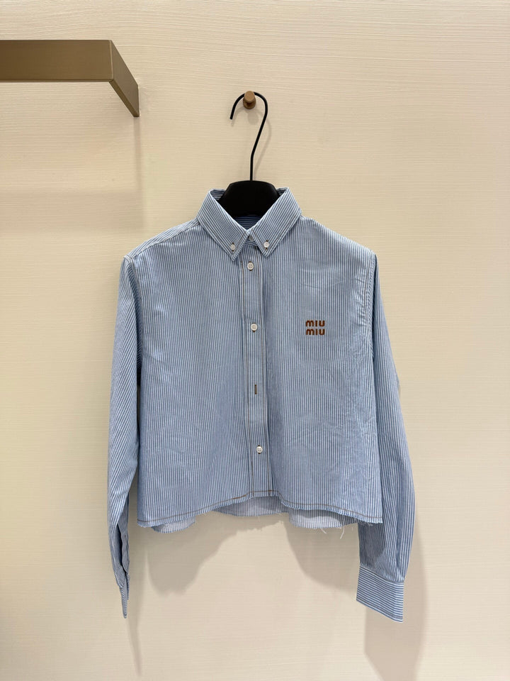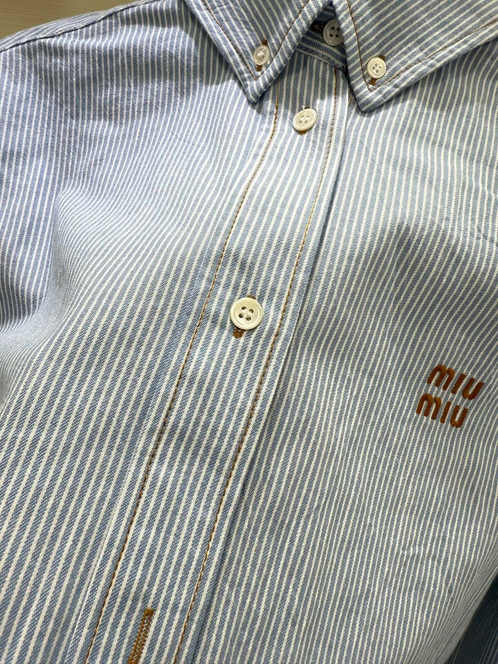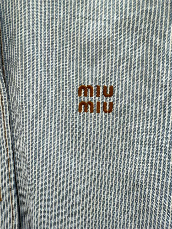 Hellfarbiger, gestreifter Denim, der durch ein spezielles Bleichverfahren entsteht, interpretiert Miu Miu neu und verleiht diesem Kleidungsstück einen Vintage-Look, der an die Retro-Ästhetik des Sommers erinnert.