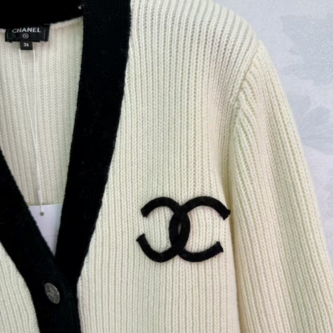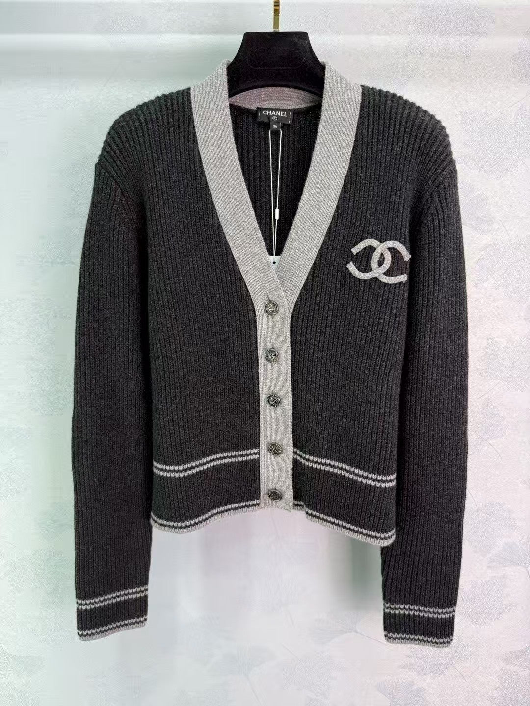 25 New early autumn color-blocked knitted cardigan V-neck design is slim and fashionable, embellished with classic double C logo and silver round buckle decoration. The contrasting color combination is full of high-end feel. The knitted fabric is soft and comfortable, with clear and three-dimensional texture. It is suitable for autumn and winter wear and is versatile and fashionable!