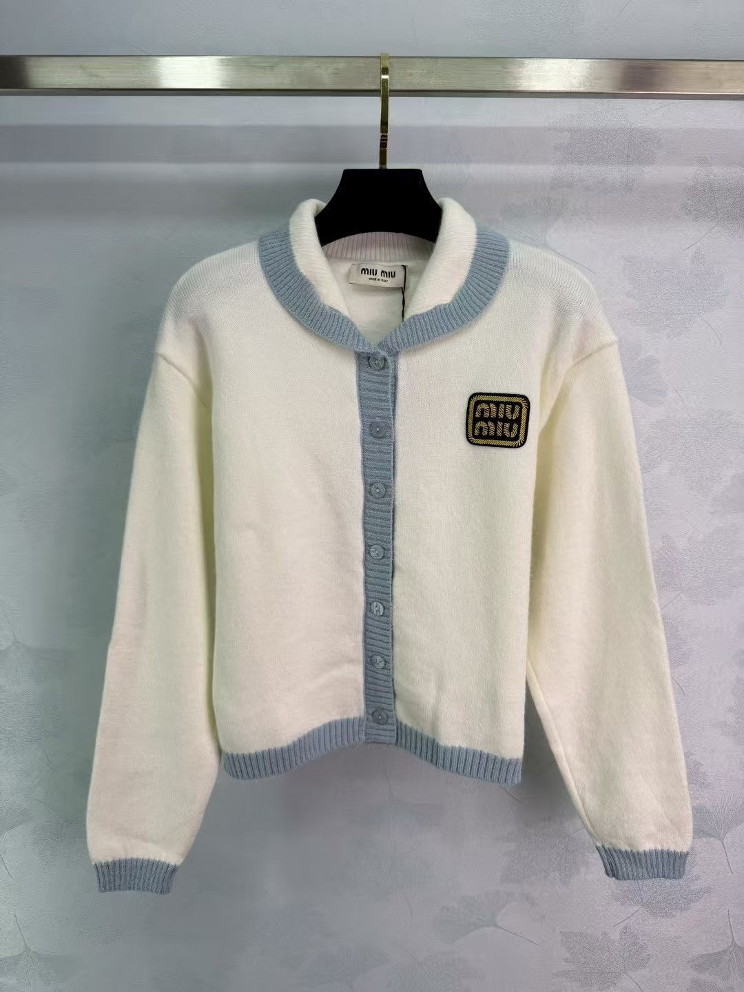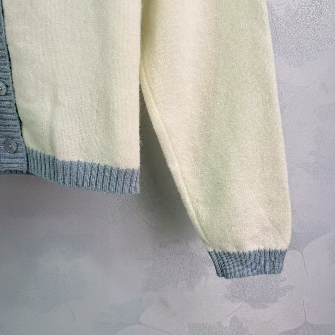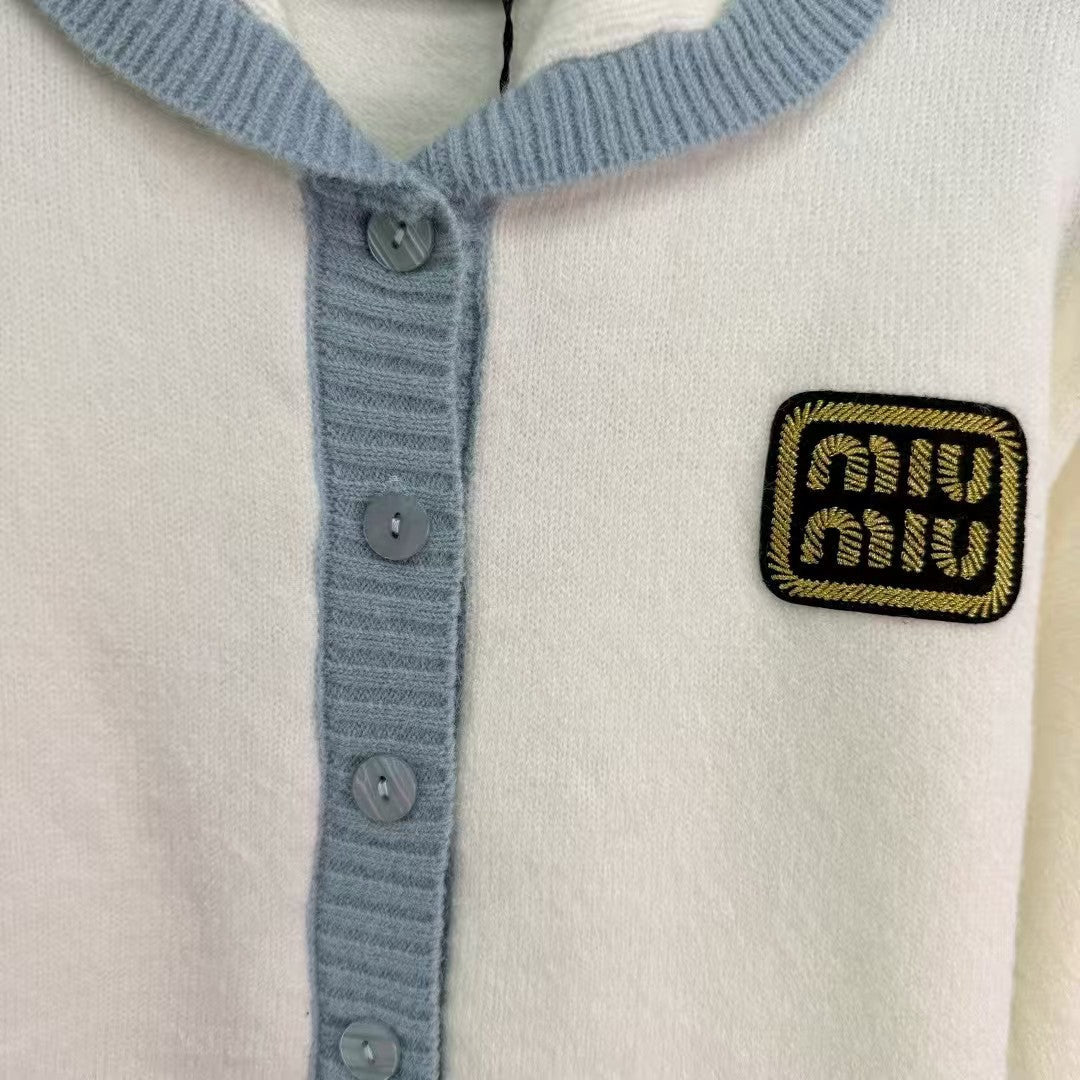 25 New knitted cardigan for early autumn, light blue collar design, gold logo embroidery on the chest, simple and generous, white body with light blue collar, fresh and elegant, regular version is versatile and suitable for everyone, playful and age-reducing, and easy to wear for daily travel or parties!
