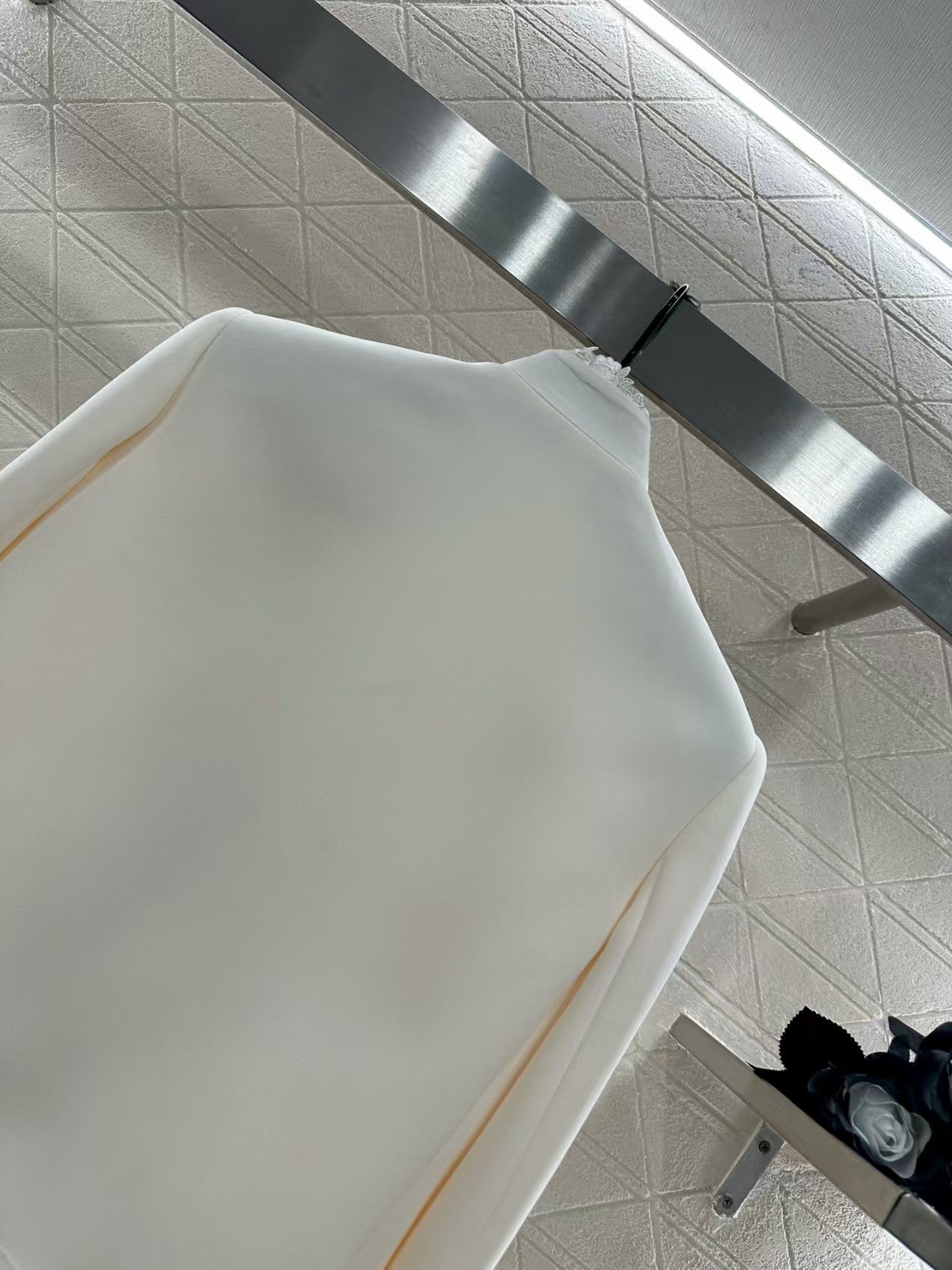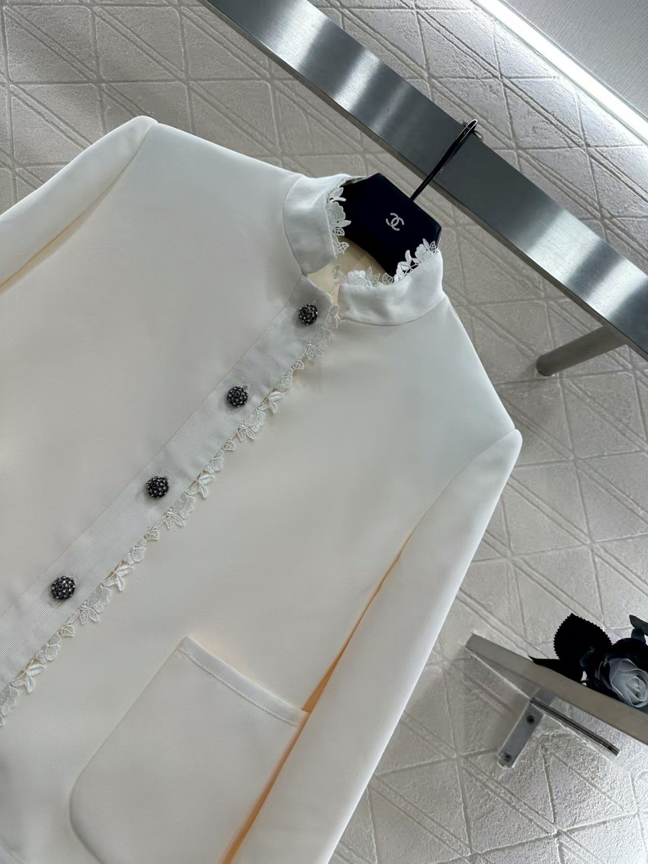 Customized with imported YB suiting material, this jacket boasts a textured, lustrous look and a crisp, sophisticated aesthetic. The slim-fitting, stand-collar blazer features a straight shoulder cut that hugs the body for a more defined silhouette and accentuates the wearer's style. Rhinestone distressed buttons enhance the visual impact. Symmetrical pockets enhance the proportions. The concealed water-soluble hollow lace embellishment extends from the neckline to the front, further enhancing the elegant aesthetic. This sophisticated piece is perfect for commuting or attending important events, showcasing luxurious taste.