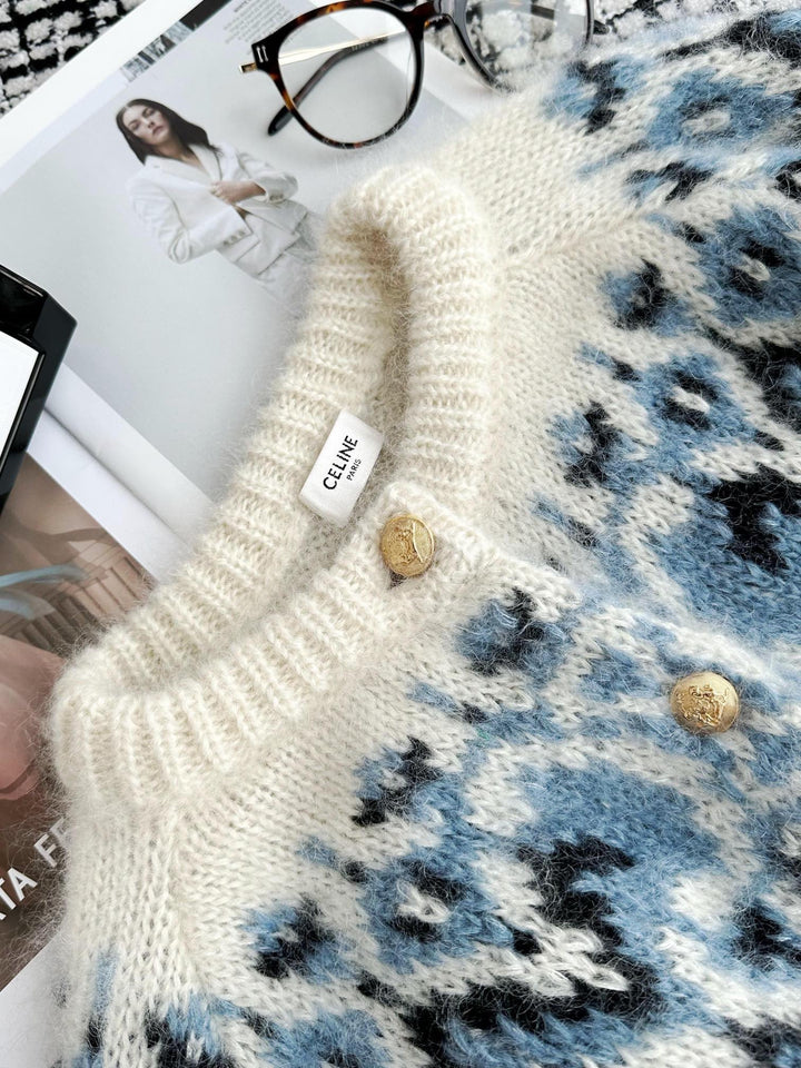Hergestellt aus Mohair-Mischgewebe, weicher und bequemer Stoff, exquisites Muster, das durch Blumenpflücktechnologie erzeugt wurde, weite Version mit überschnittenen Schultern, individuelle Metallknopfform für die Vorderseite, lässiger Stil ohne Verlust des Modebewusstseins, mit einem Designgefühl für Gittermuster, das ein Retro-Temperament erzeugt, kombiniert mit einem einzigartigen Stil des Logomusters, das für mehr modischen Spaß sorgt und leicht eine wundervolle und einfache nordische Atmosphäre schafft.