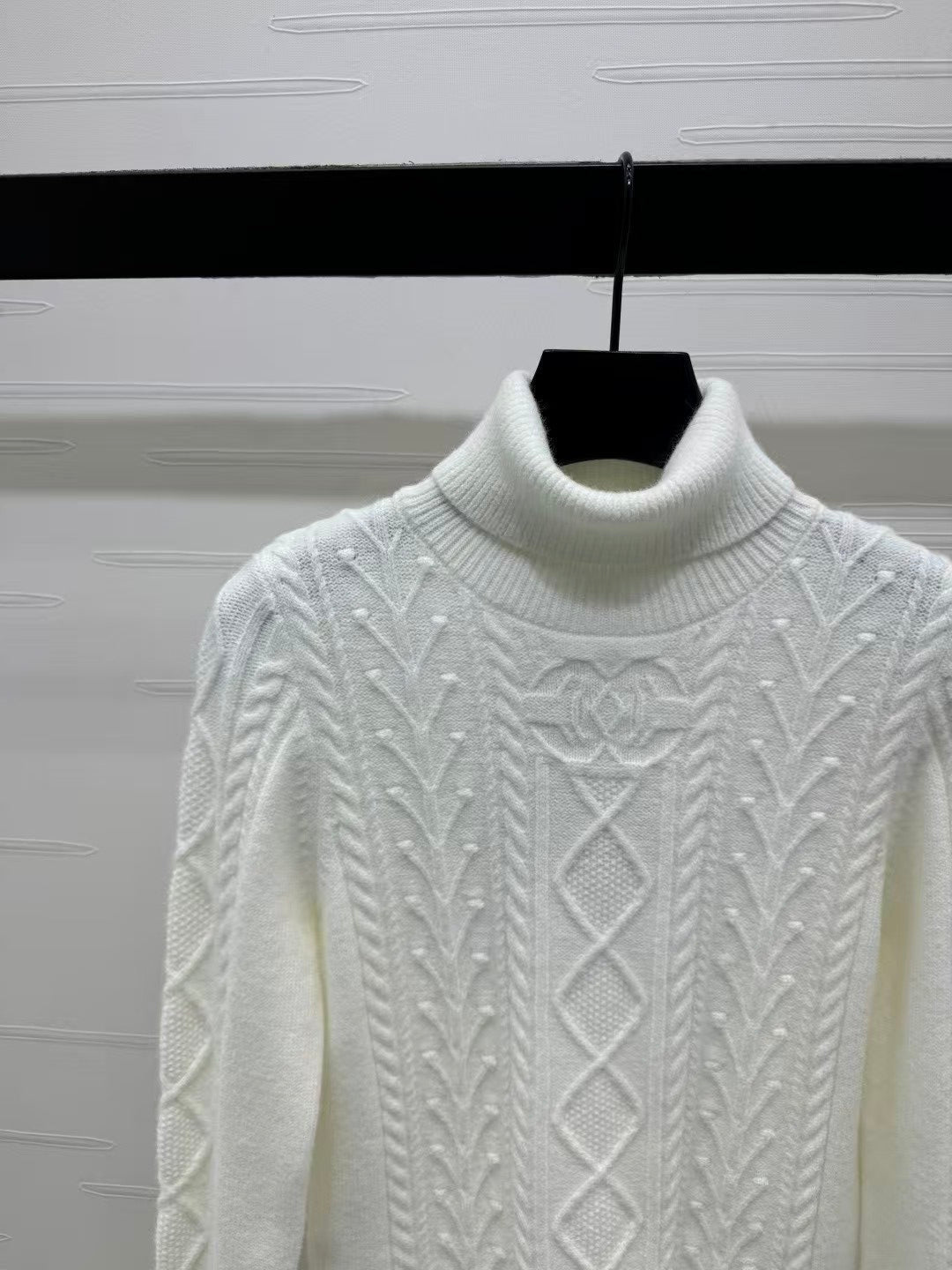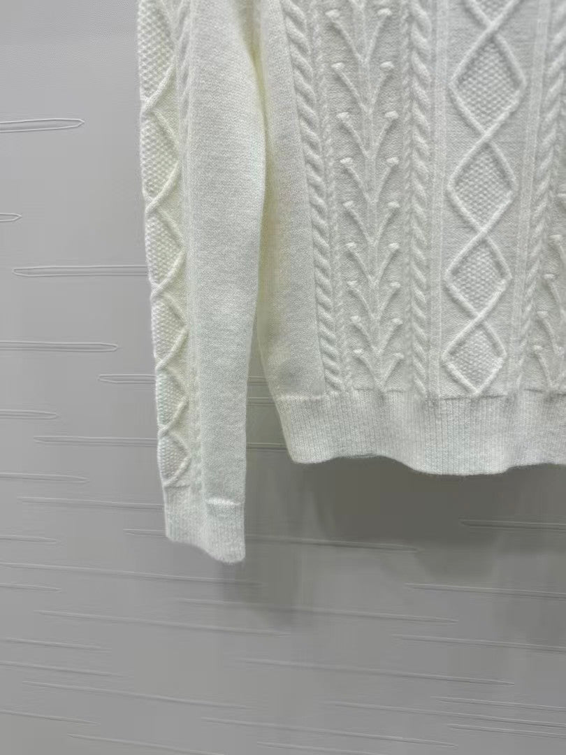 The latest Fall/Winter 2025 collection! A high-neck knitted long-sleeved top! Custom-made imported wool knit for comfort and softness. The main body features a vertical twist pattern with a diamond quilted crochet design. The cuffs and hem are ribbed for added dimension. Crocheted letters on the chest and matching rhinestones on the sleeves highlight the brand's signature. The high-neck, long-sleeved top is tailored to accommodate any figure for a stylish and casual look.