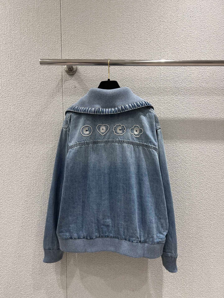 Twill-Baumwoll-Denim-Material, enzymgewaschenes Blau mit natürlichem Aufhellungseffekt, vielseitige Retro-Jeansversion mit Reverstasche und Reißverschluss, solides und kräftiges Material, Kragen kann hochgeschlossen sein für mehr Wärme, Manschetten und Saum mit vertikalen Rillen und Fadenspleißen, reichhaltige Designschichten verstärken das Luxusgefühl der Marke, Modebewusstsein ist ausgeprägter, gepaart mit Herzmuster auf der Brust, modisch und stilvoll, vielseitig für alle Jahreszeiten.