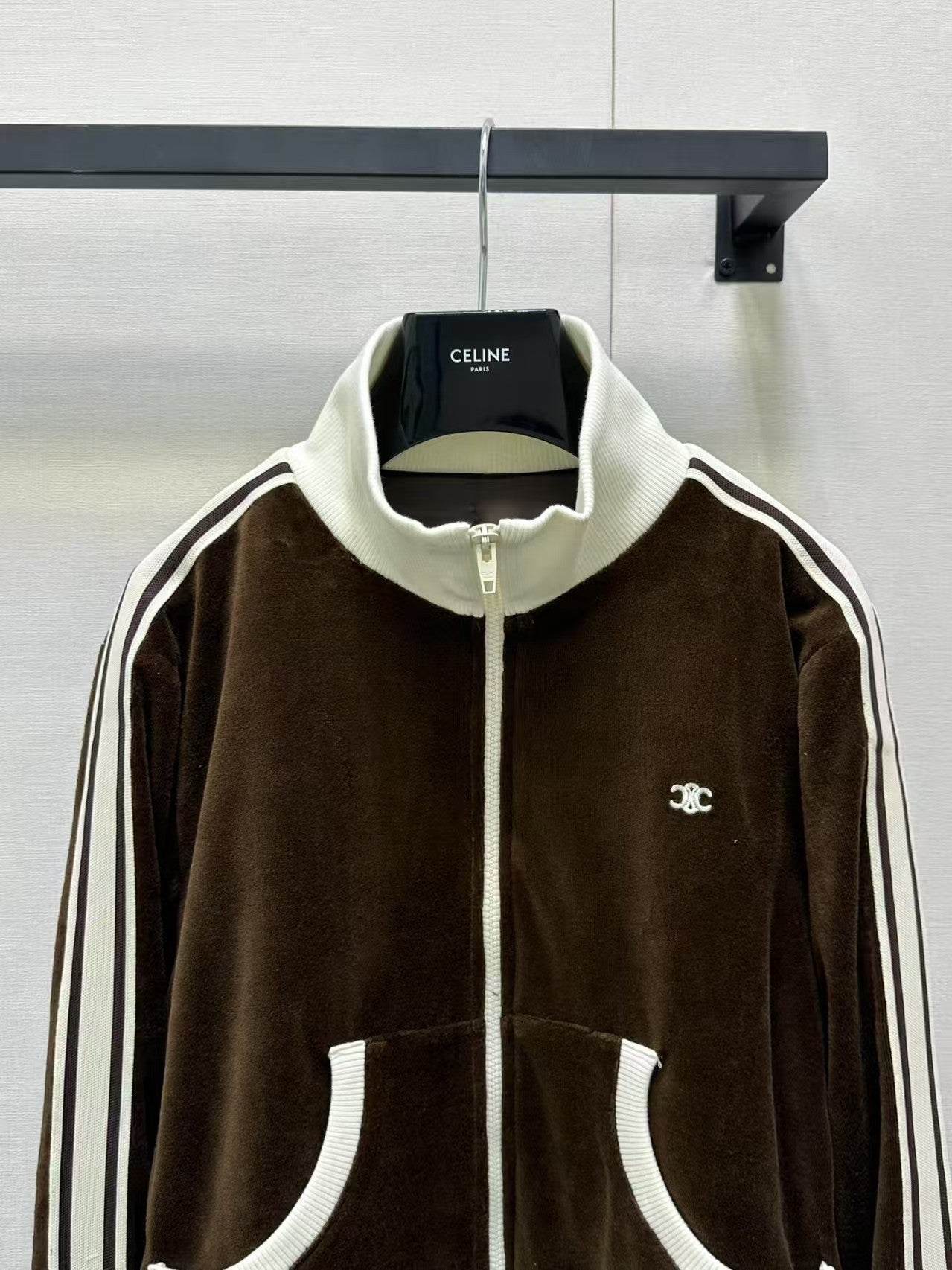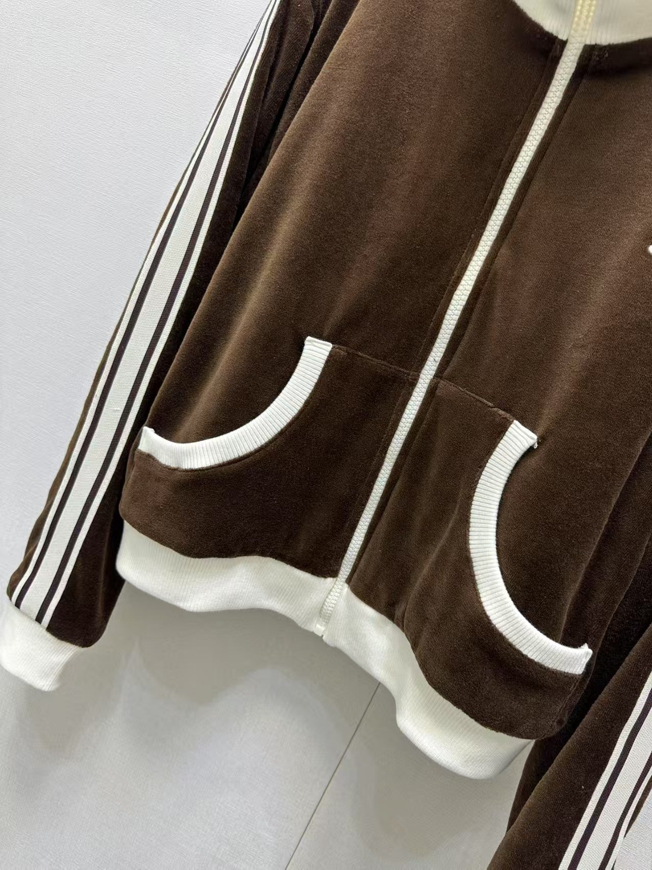 25ss spring and summer new Arc de Triomphe zipper stand collar casual top. Velvet material, high-quality texture, stand-up collar zipper, contrasting color design, low-key and fashionable, full of brand tone, Arc de Triomphe logo echoes, adding a sense of design layering, showing a fashionable style