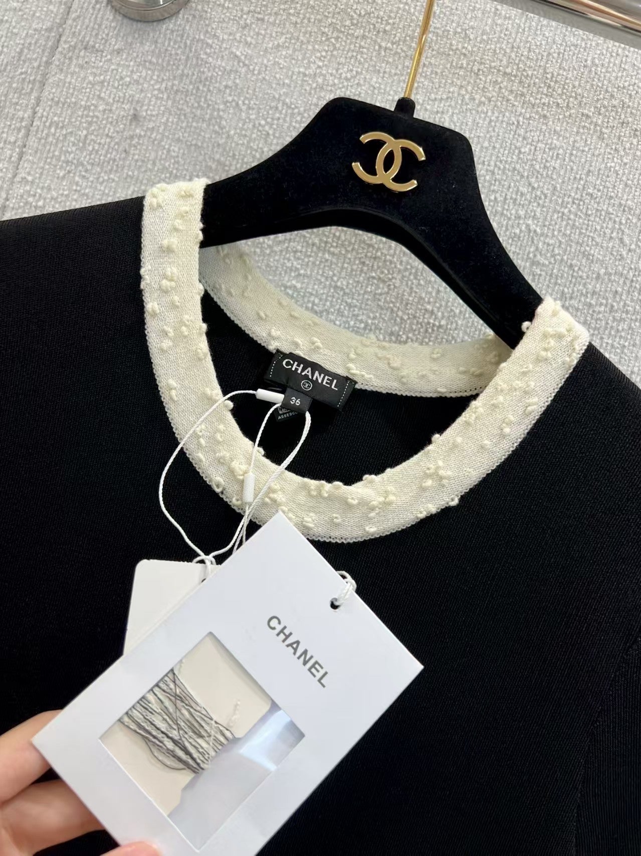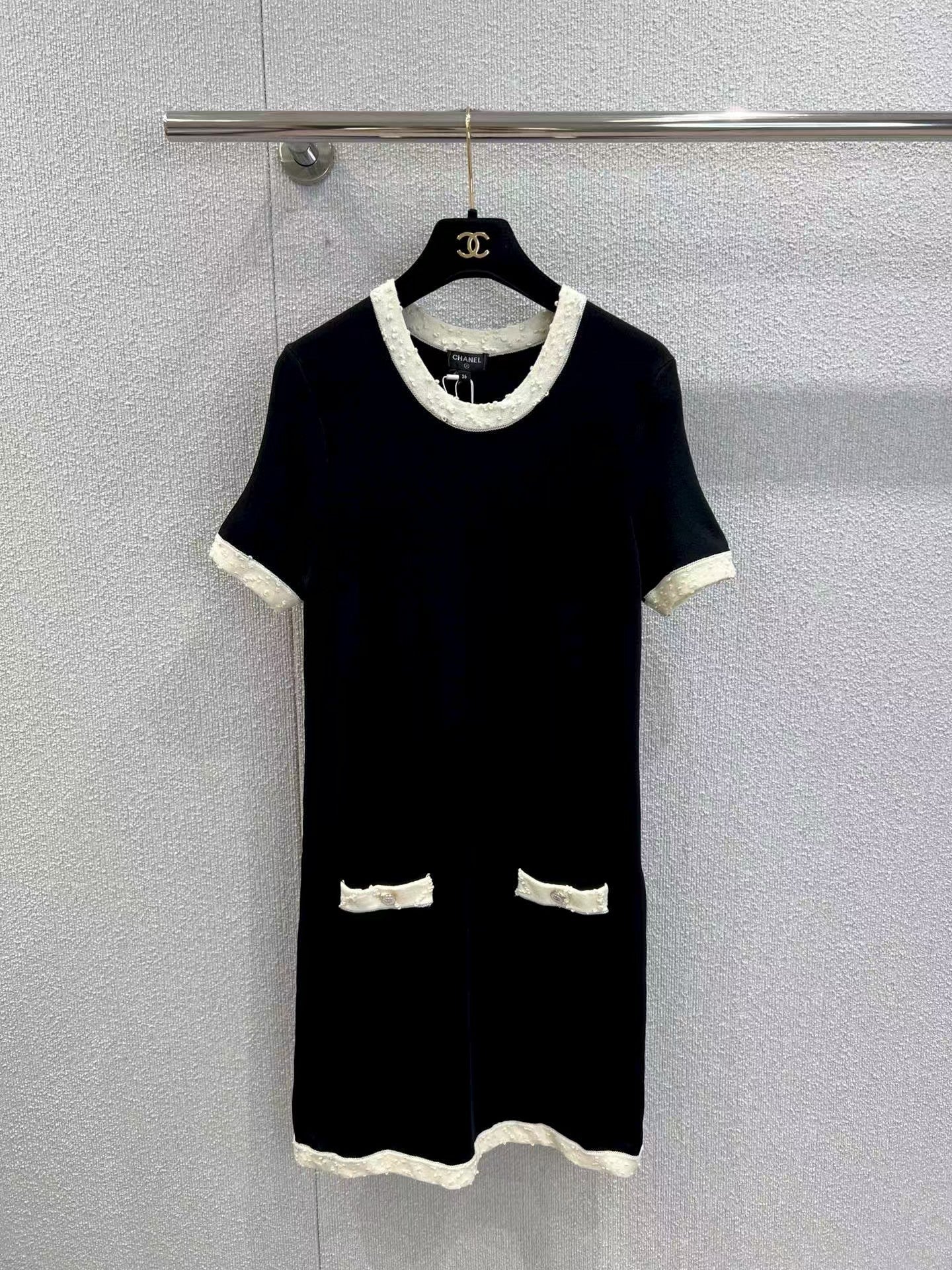 25 Handicraft Workshop Series New Black and White Contrast Knitted Short Sleeve Dress | ⚠ Exclusive High Edition Product! Two pockets, logo and metal button embellishment, regular shoulder fit, accommodating body shape, fashionable and casual wear, stylish and slimming top, full of temperament, simple and fashionable, suitable for all
