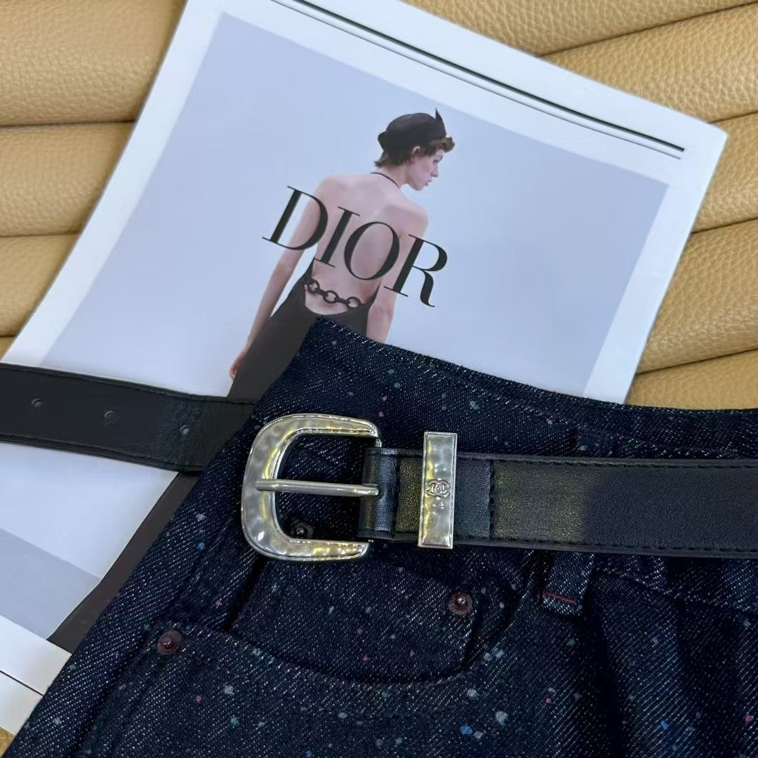 Double C color spray-dot original color jeans with double C metal belt embellishment details. Straight-leg jeans are suitable for all leg shapes. No brainer to match them, they automatically hide fat and make you look taller. Dark blue is particularly versatile. The whole design is lazy, casual and tonal. Details are online