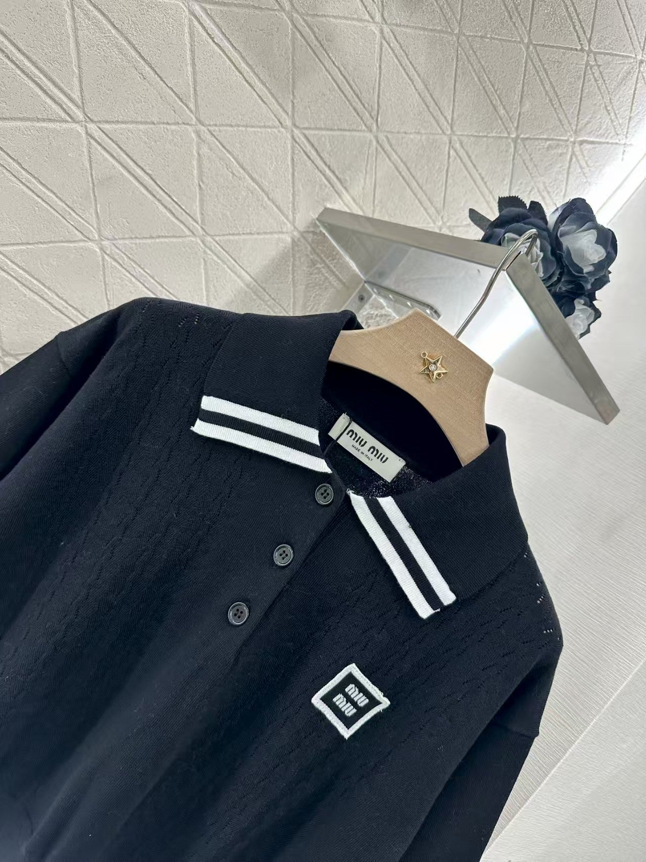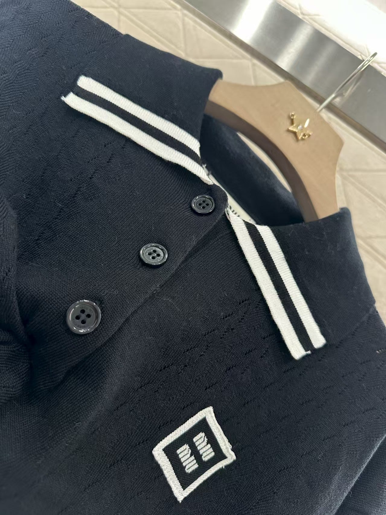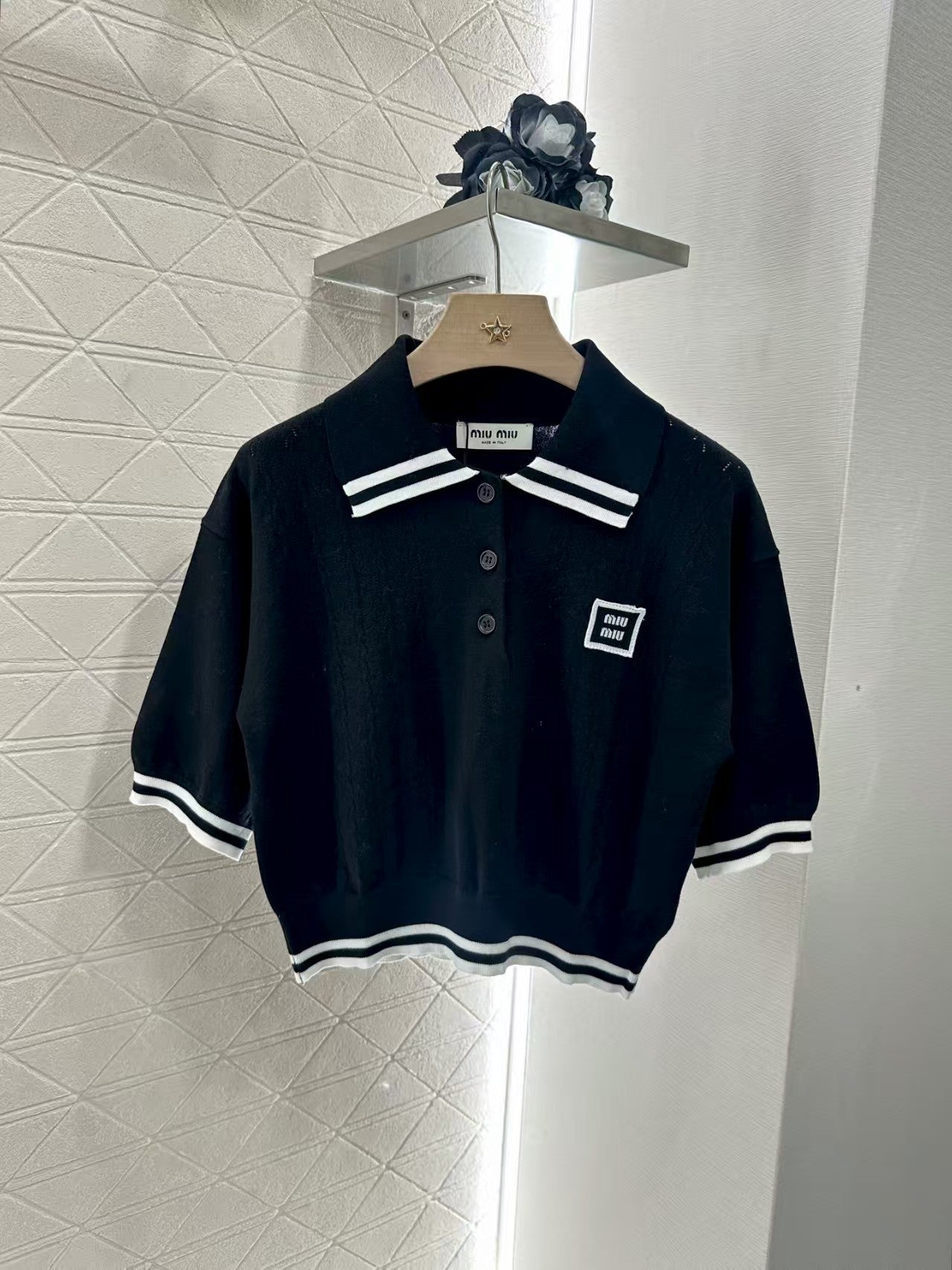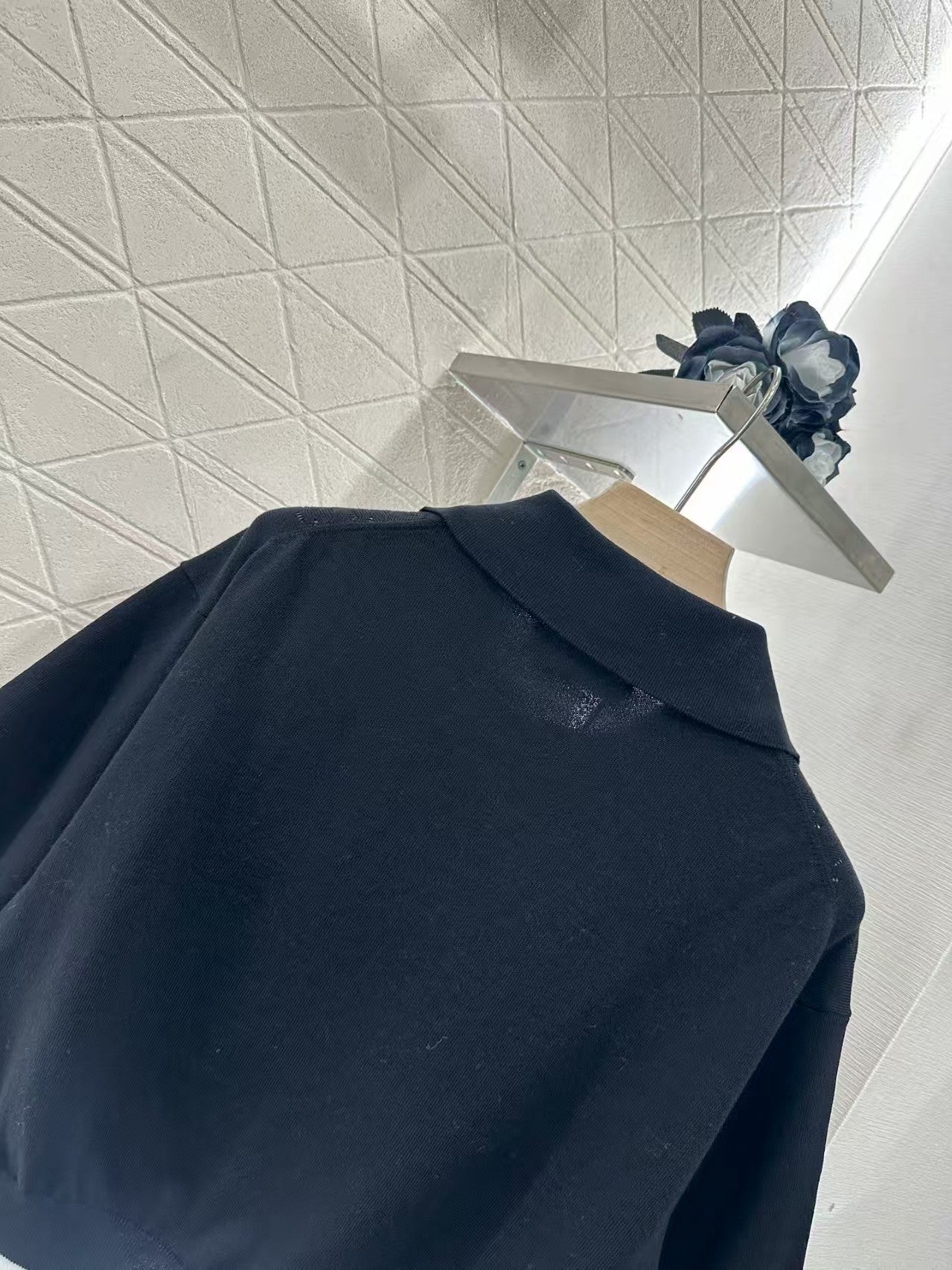 , comfortable texture, hollow and breathable, lapel half-open placket 𝑝𝑜𝑙𝑜 short sleeves, the whole body is interwoven with crochet texture, outlining the collision of vertical stripes, the brand letter logo is embroidered on the chest, highlighting the high-end sense of wear, the collar, cuffs and hem are made of contrasting stripes and threaded lace, elastic and tight for more exquisiteness, and slimming wear, short version, showing a small waist, showing a relaxed tone, highlighting the light luxury and fashionable temperament, can be worn alone or layered, the first choice for fashionable wear in all seasons