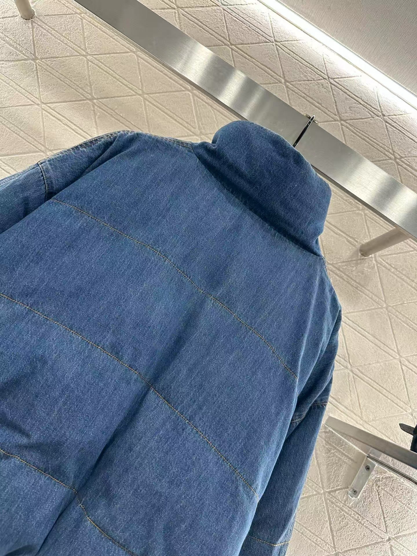 Customized YB twill cotton denim with down lining for lightweight warmth. The stand-collar snap-button jacket features a refreshing denim blue colorway to break the dullness of autumn and winter. Elastic hems at the cuffs and hem provide exceptional wind and warmth protection. The front features a single row of snap buttons and spacious side pockets. The design is crisp and sophisticated. The lining is highlighted with signature jacquard lettering. The regular fit is versatile and pairs well with skirts or pants for a high-street chic look.