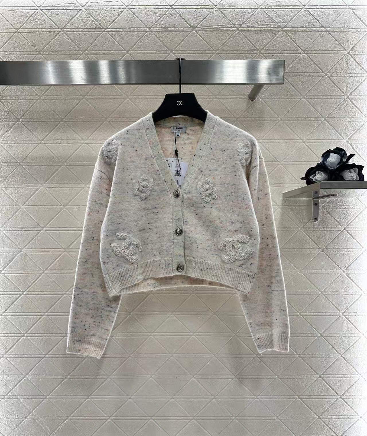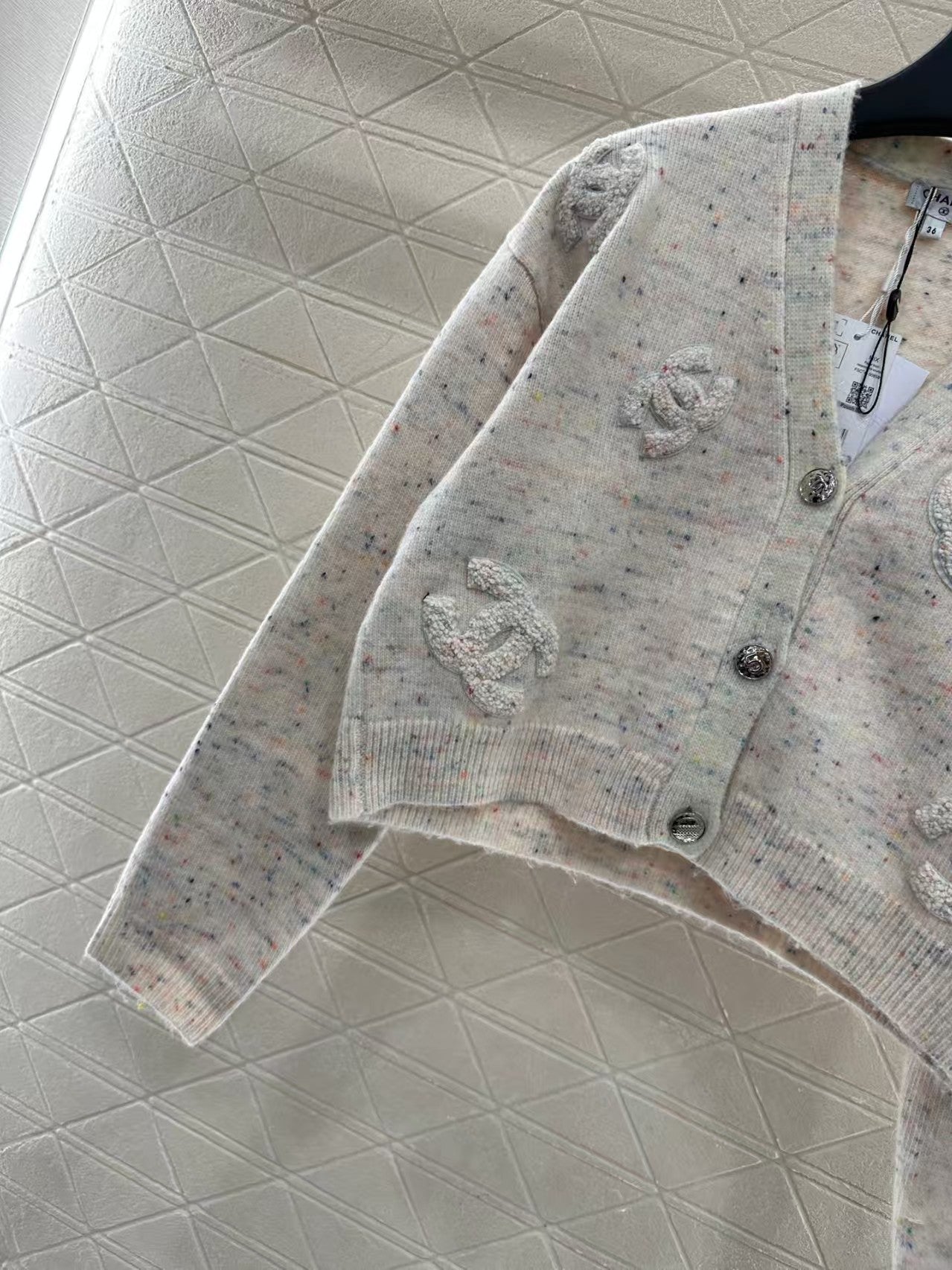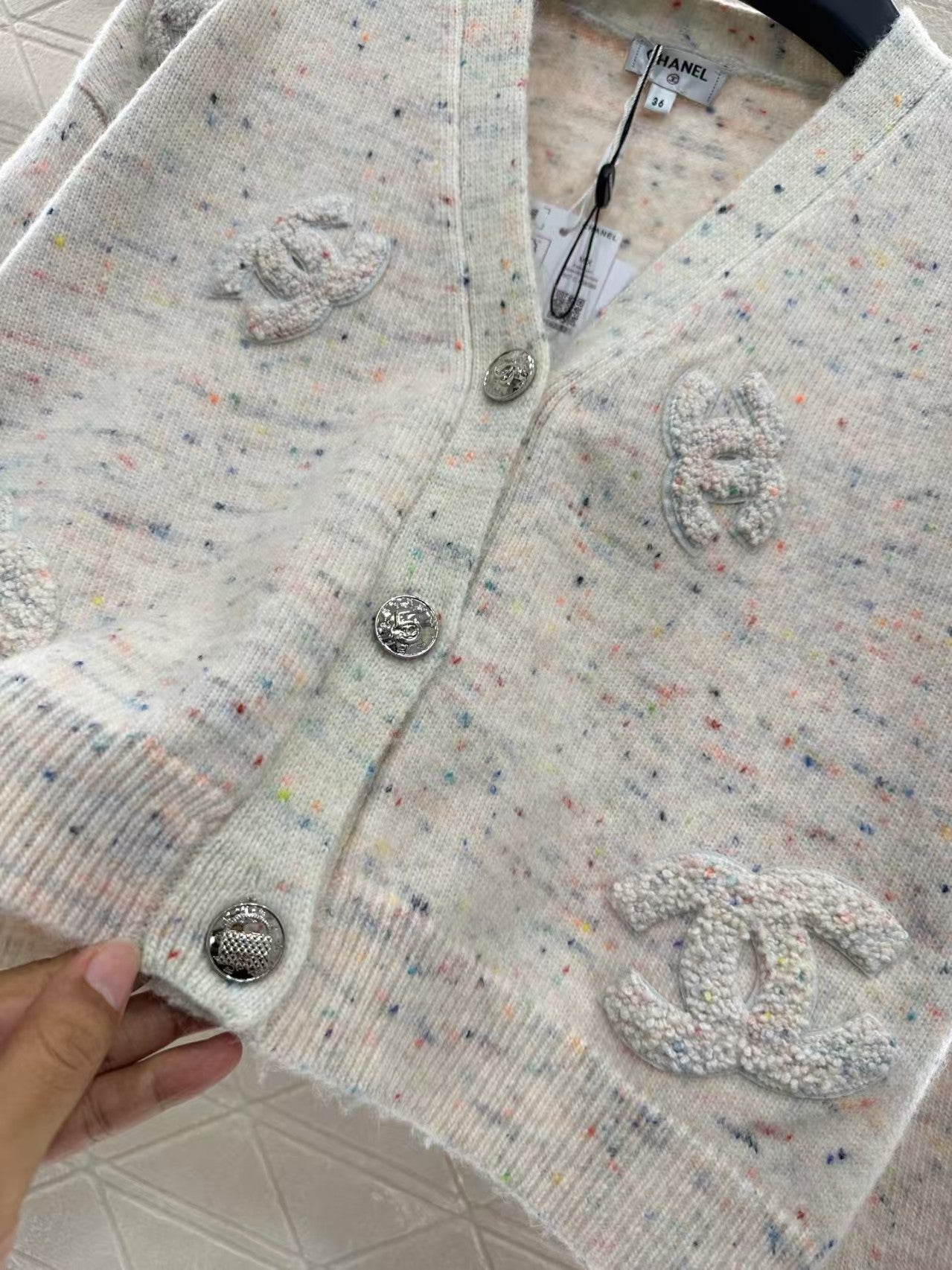 Crafted from custom YB cotton yarn, this cardigan offers a refined, comfortable fit. This V-neck, cropped cardigan features a custom-made twist button design that flatters the neckline and adds a touch of sophistication. The cardigan is embellished with a 3D plush Double C logo throughout, and the vibrant, colorful background adds a touch of style. Break the dull autumn and winter vibe with this stylish, sophisticated look.