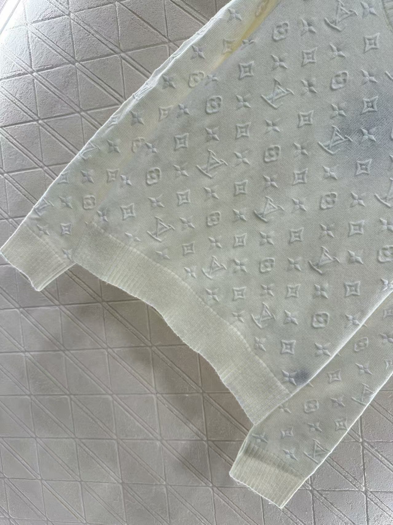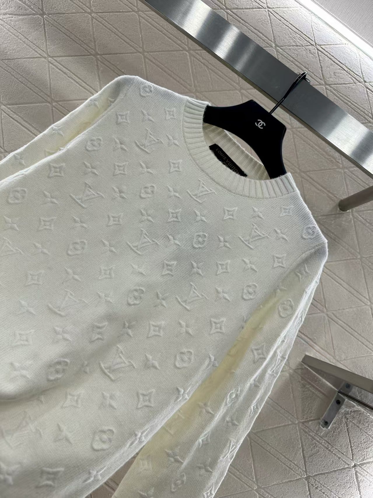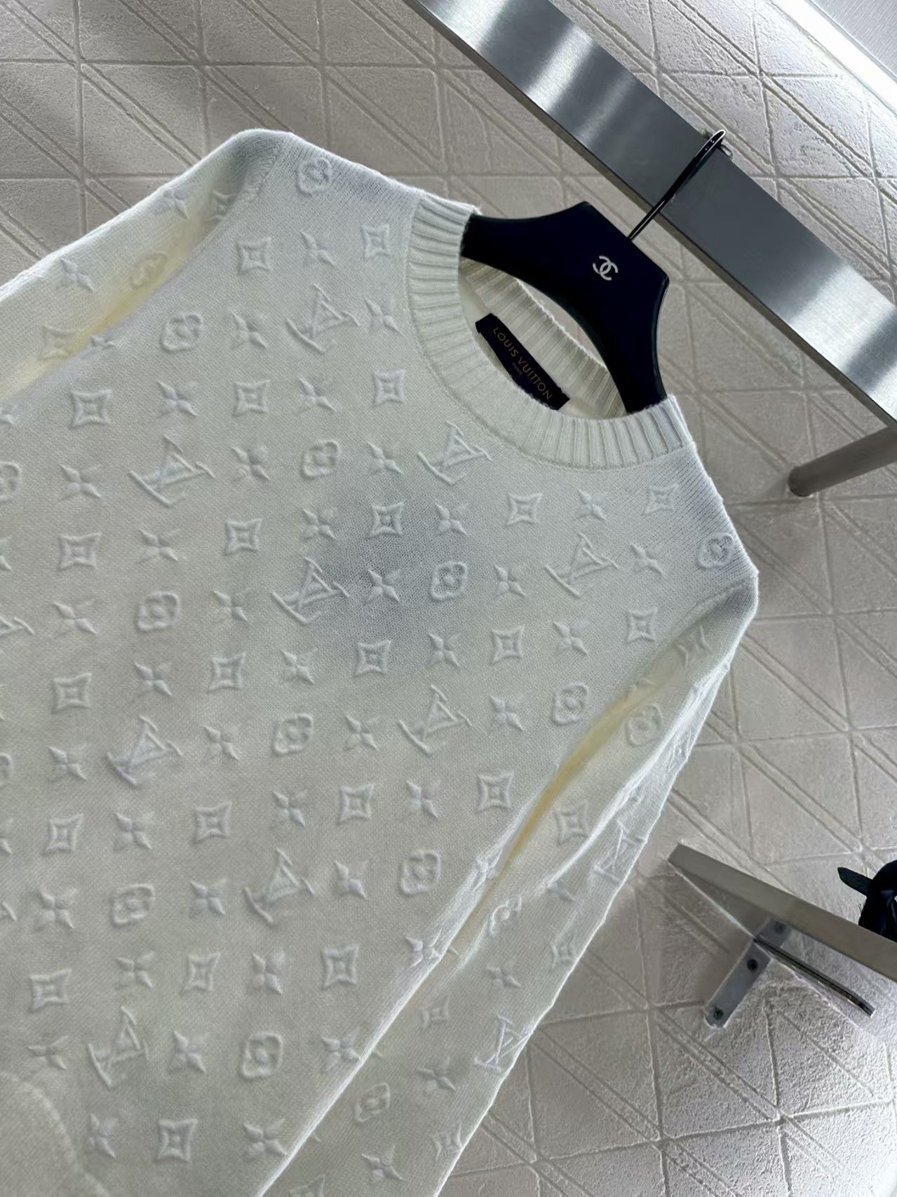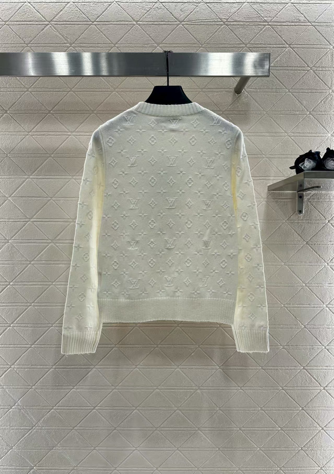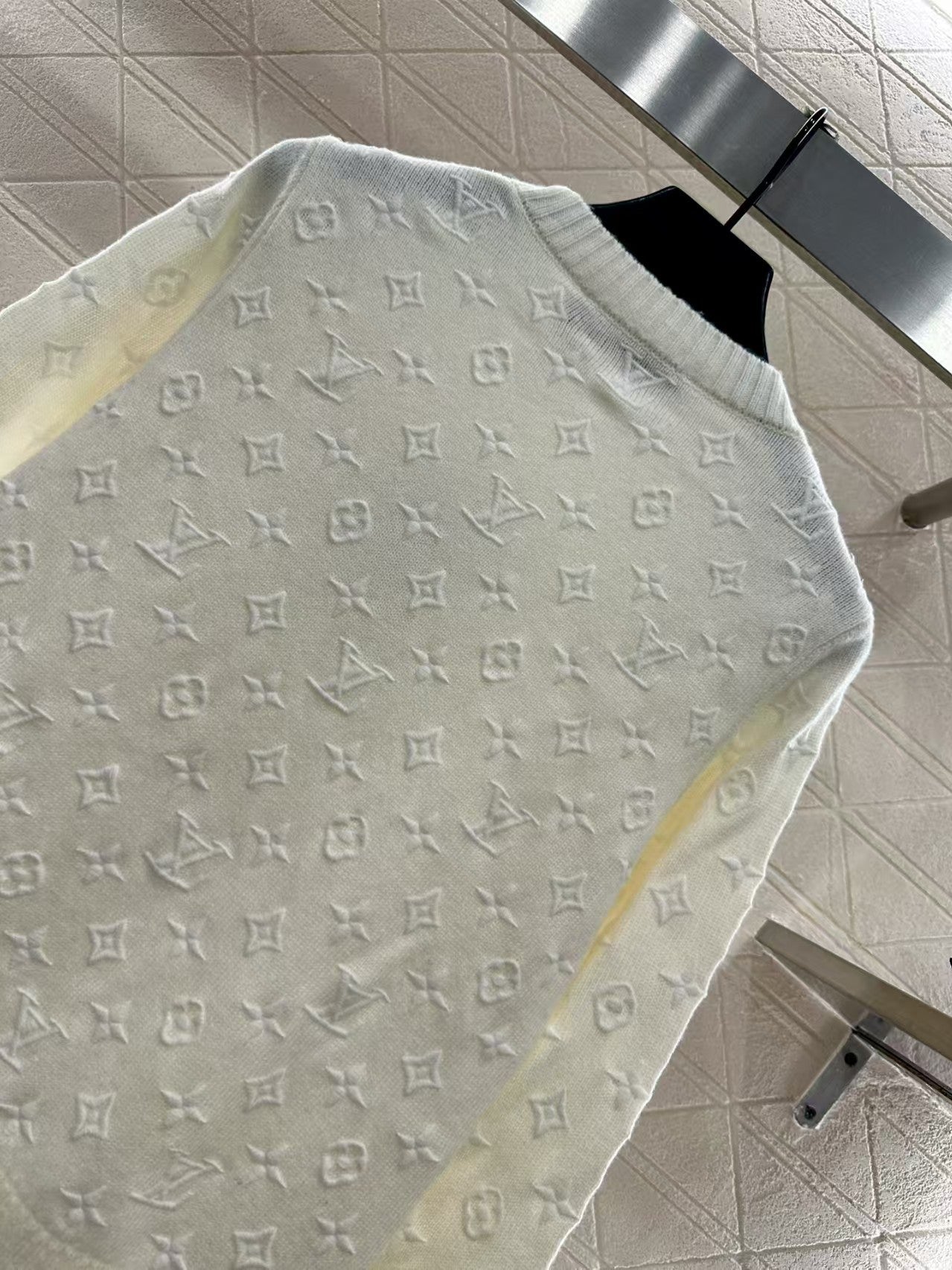 Crafted from custom YB cashmere yarn, the cashmere material offers a soft, velvety feel. Embroidered with the classic LV monogram, this sweater embodies elegance, warmth, and style. The round neckline and cuffs feature a ribbed design for an elegant, relaxed fit. Elastic cuffs cinch the cuffs, and the monogrammed leather buckle complements the all-over 3D four-leaf clover motifs. The overall look is sophisticated and stylish. The pinpoint embroidery creates a unique, trendy brand identity, adding a touch of style to a versatile and stylish look.