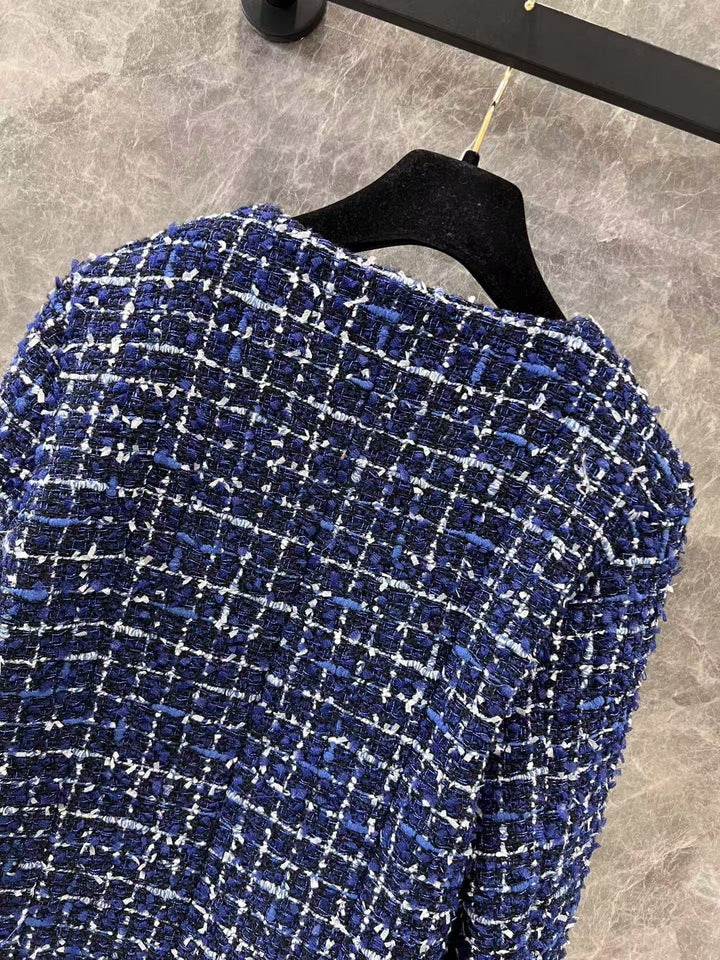 Chaqueta de tweed azul Streamer, estilo primavera/verano, cuello redondo, diseño de un solo botón, color azul marino retro. Confeccionada en tejido de cuadros pequeños personalizado por YB, con forro jacquard y corte recto. La parte superior luce estilizada y elegante.