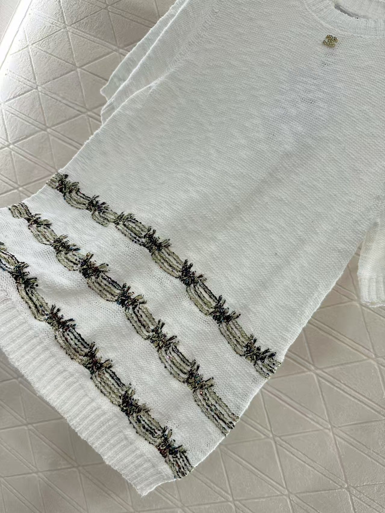 Made with custom YB cotton yarn, soft and skin-friendly, comfortable and stylish, short sleeves, neckline adjustment to expose skin, light and slightly transparent, overall beautification of head-to-shoulder ratio, slimmer, black and white available, triple contrast with gold thread embroidery on the hem, strong retro style, double C logo decoration with rhinestones on the chest, showing taste, slim elastic version to highlight the figure, elegant temperament, easy to wear for daily travel or parties