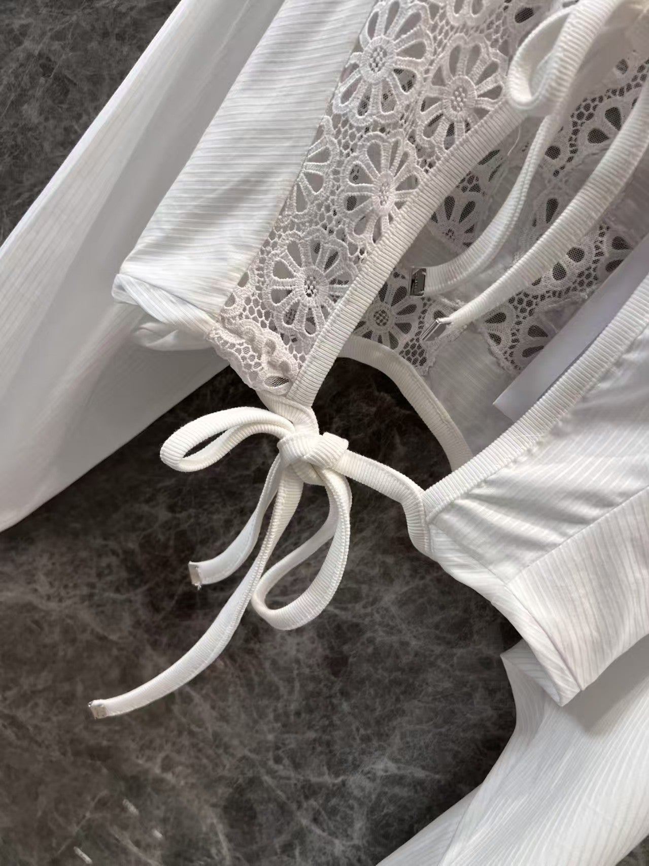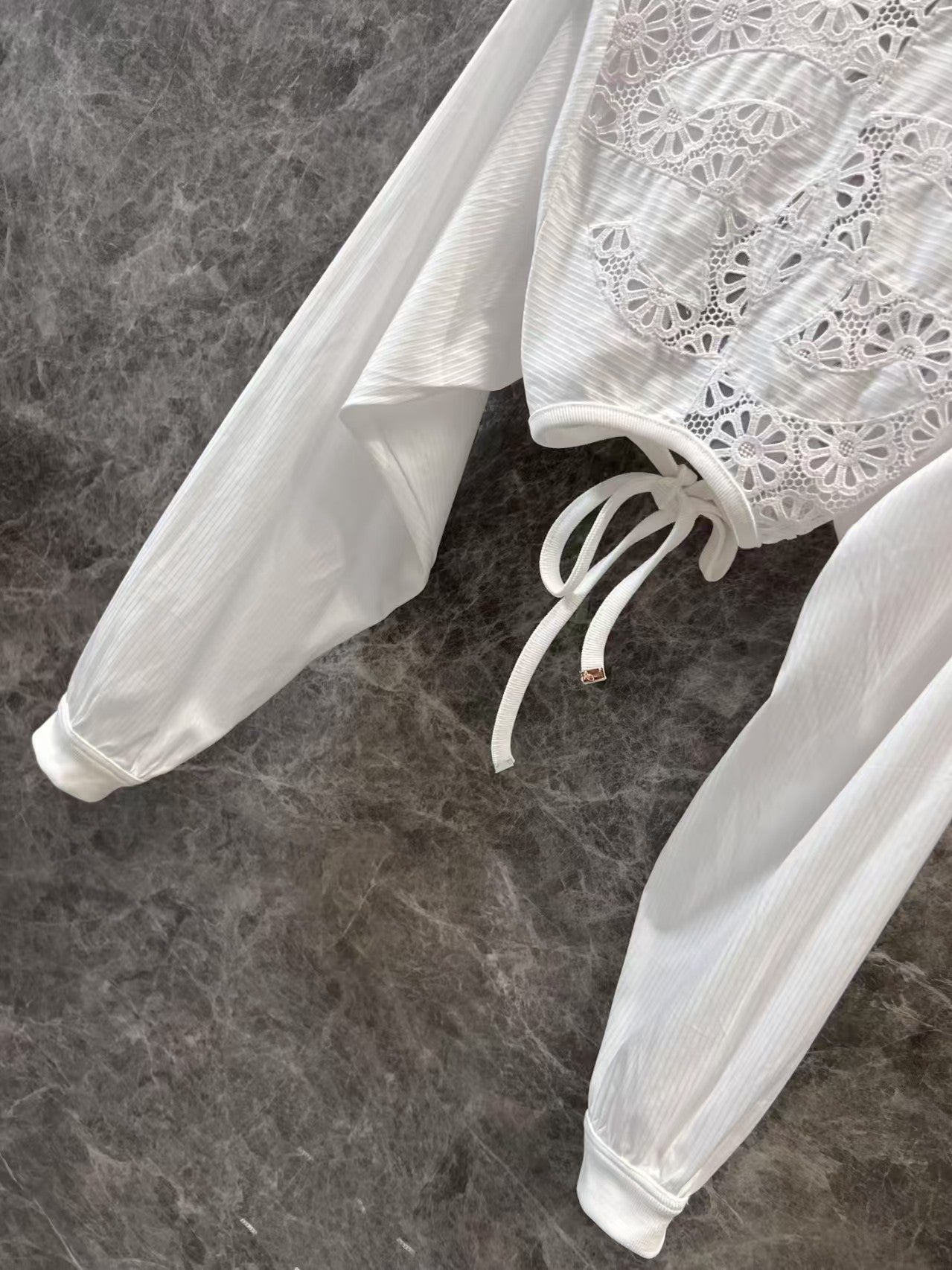 25Ss Spring and Summer New Heavy Hollow Backless Short Long Sleeve Top | Customized cotton poplin fabric, double C on the chest using applique embroidery technology, water-soluble flowers are cut