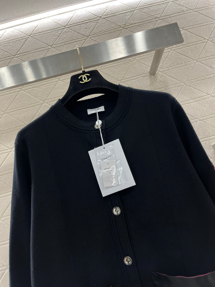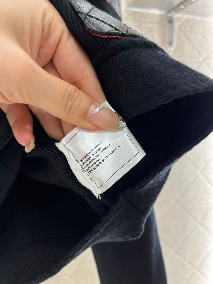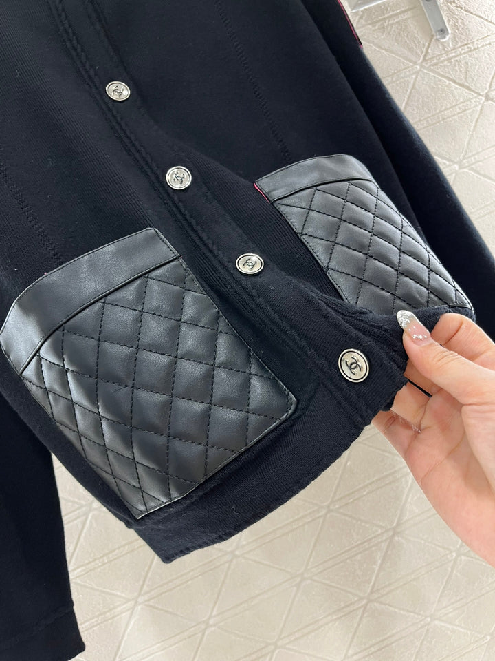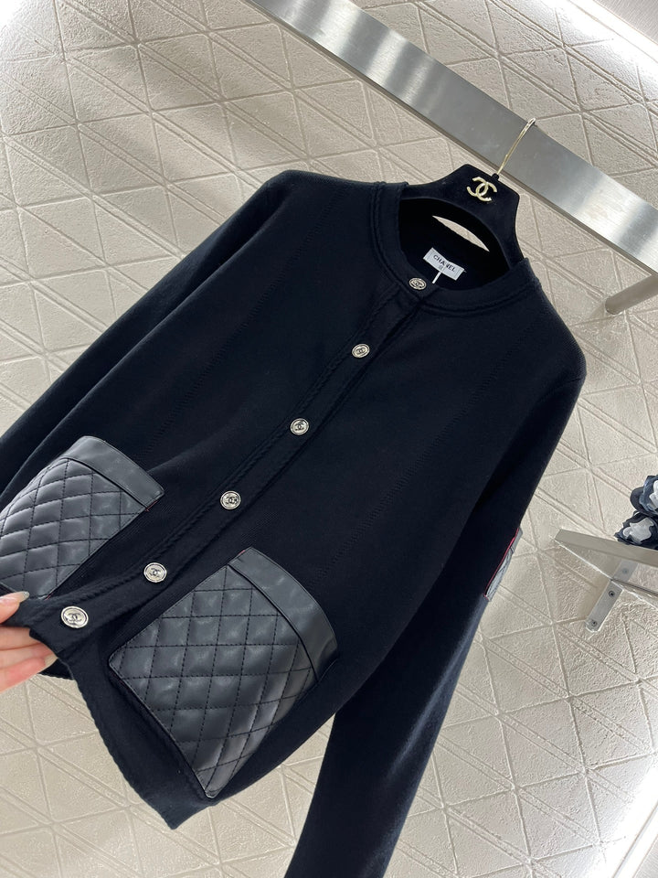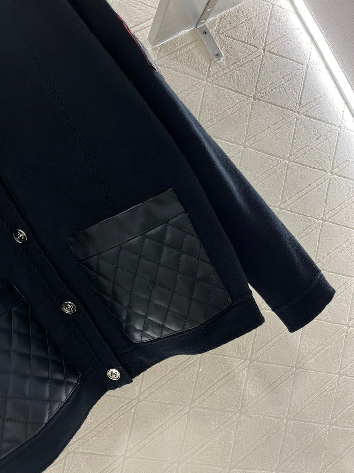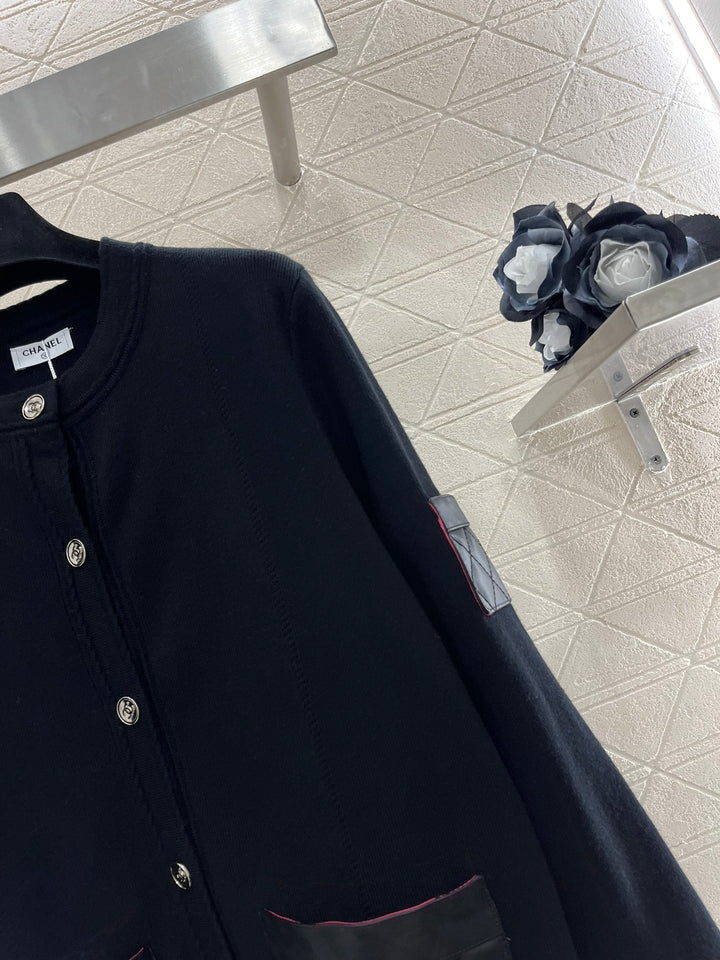 Hilo de lana importado YB personalizado + costura de cuero, textura de alta calidad, textura obvia, corte de cárdigan de manga larga, versión suelta de hombros rectos, que se adapta a la forma del cuerpo y muestra aura, los puños delanteros están decorados con la icónica textura retorcida de Chanel como borde, múltiples bolsillos de diamantes de cuero en el costado del brazo hacen eco del botón doble moldeado, lo que hace que el diseño sea más exclusivo, elegante y fresco, se puede usar en interiores o exteriores en otoño e invierno.