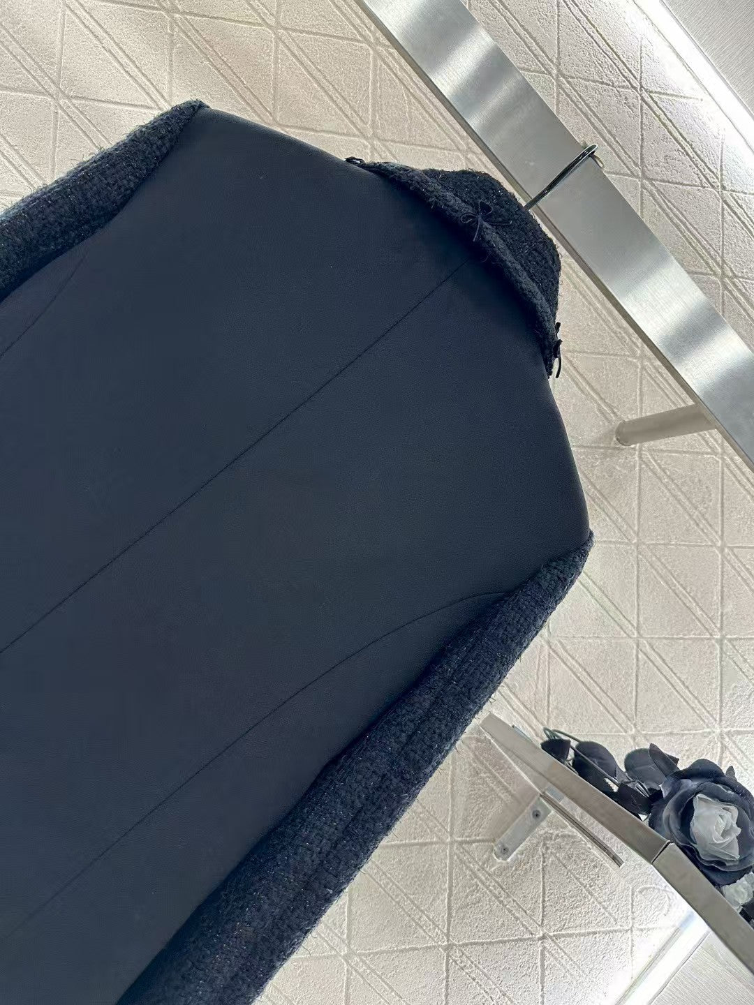 Custom-made YB imported wool tweed for a premium feel and exceptional appearance. The peaked lapel dress features a straight shoulder design that contours to the body, enhancing the silhouette's slenderness and height. Silver yarn weaves throughout the dress's design. A 3D velvet bow and double C clasp accentuate the details, creating a perfect expression of elegance and sophistication. The all-black colorway exudes elegance, texture, and intellectual sophistication.
