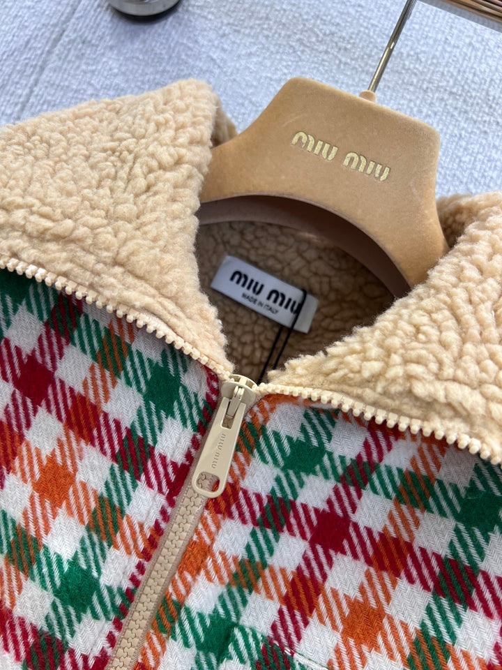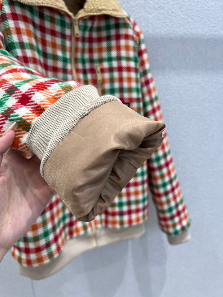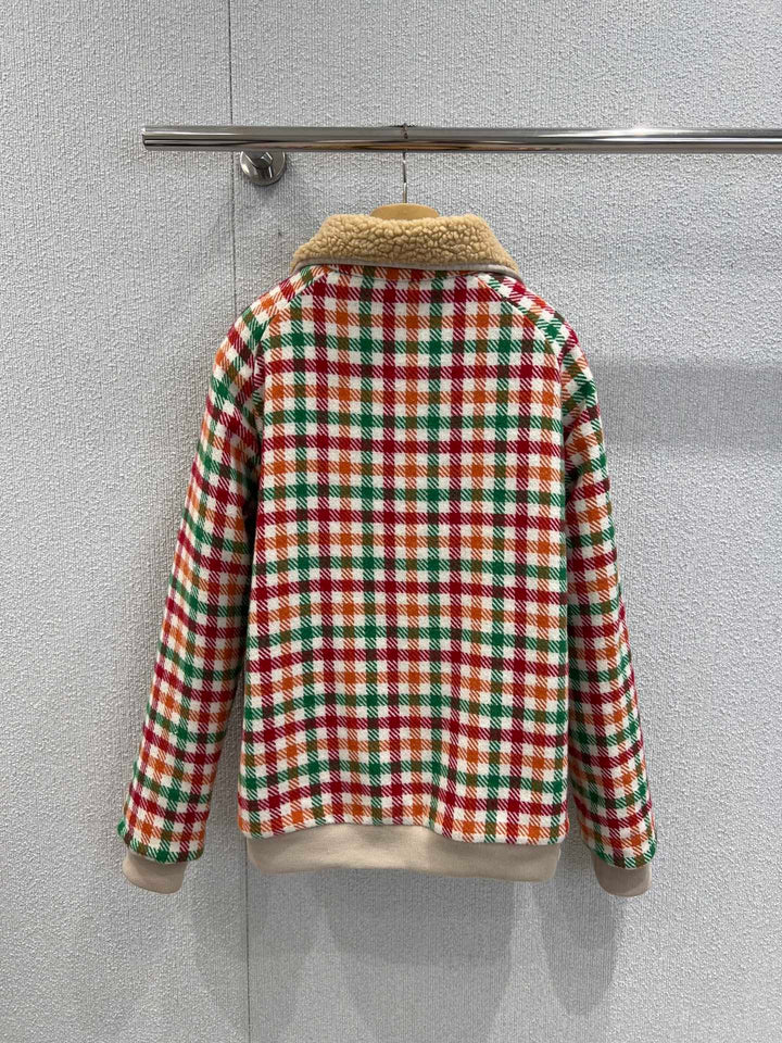 Nueva chaqueta con cuello de pelo de cordero a cuadros de colores para otoño e invierno.