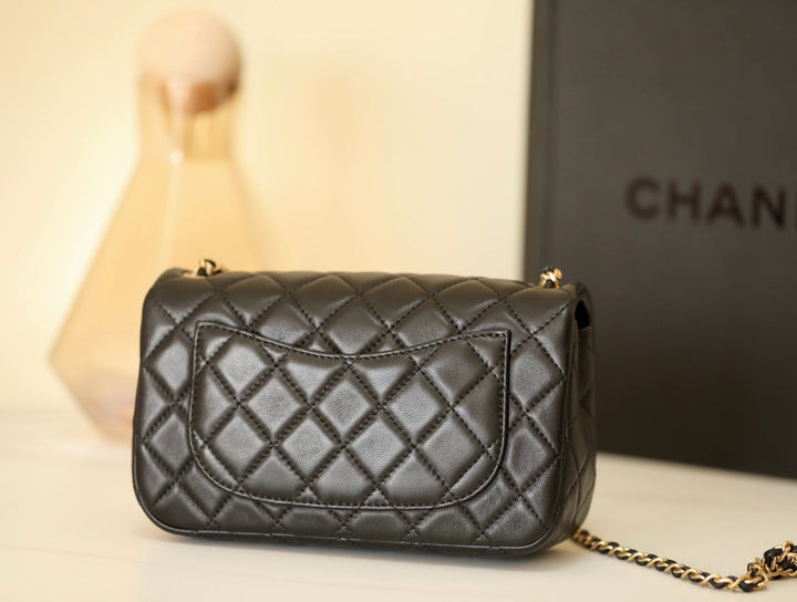 Mini bolso rectangular acolchado Pearl Crush de piel de cordero negra con herrajes dorados