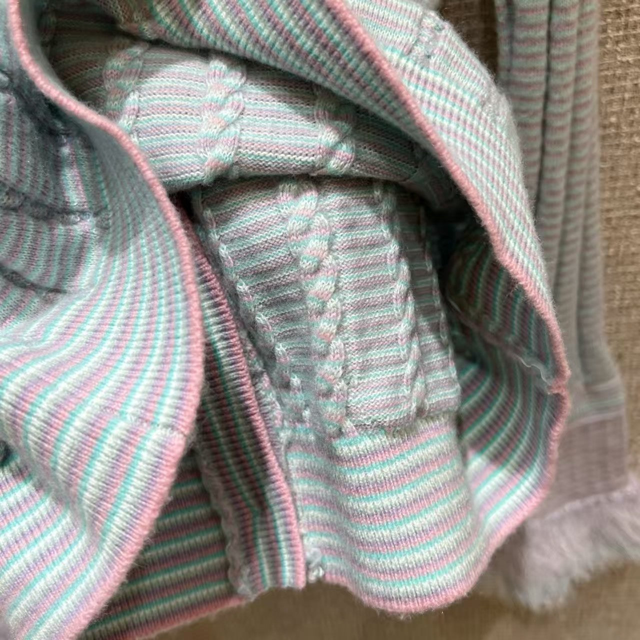 New Pocket Slim Fit Cashmere Knit Cardigan | Dyed specialty wool yarn, soft, delicate and comfortable, vertical stripe design adds three-dimensionality. Green and blue colored yarn paired with custom purple buttons for delicate embellishment, special plush ruffled cuffs for a high-end and fashionable look.