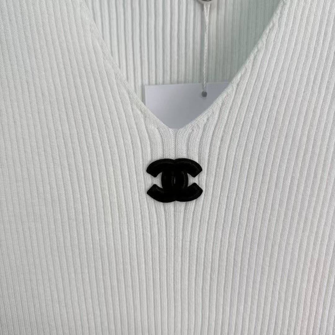 2025 Spring and Summer V-neck knitted short sleeves! Paired with flocked logo pattern to highlight the brand tone, just the right amount of skin exposure to highlight the gentle and mature charm, fitted version, the first choice for daily commuting and dating!