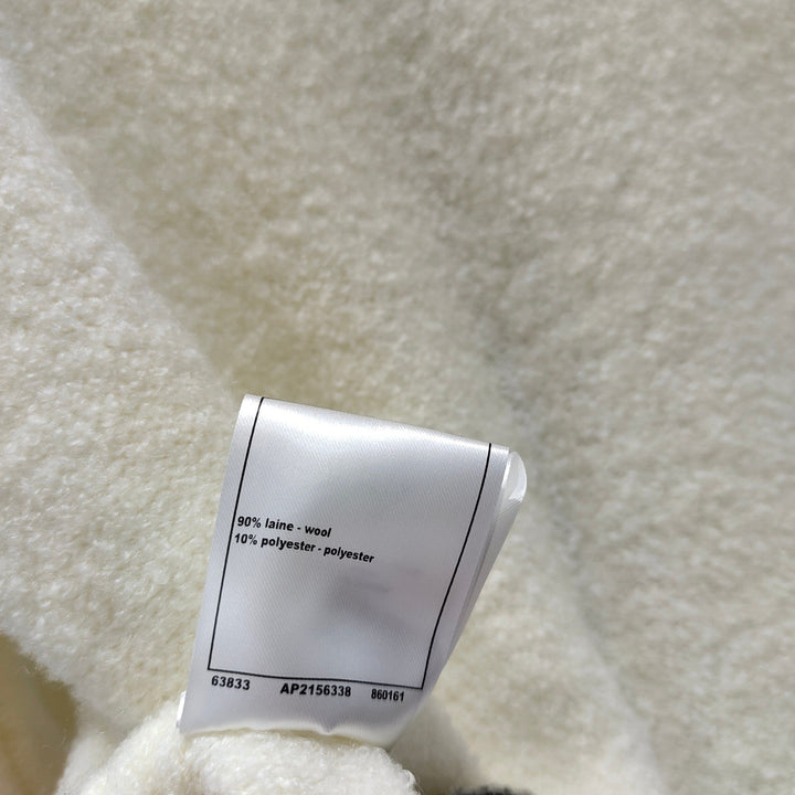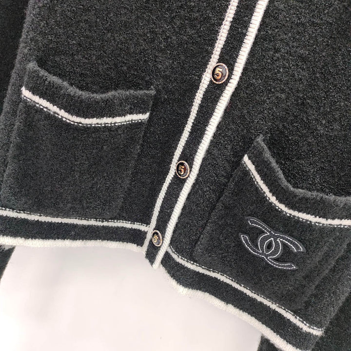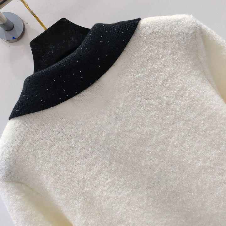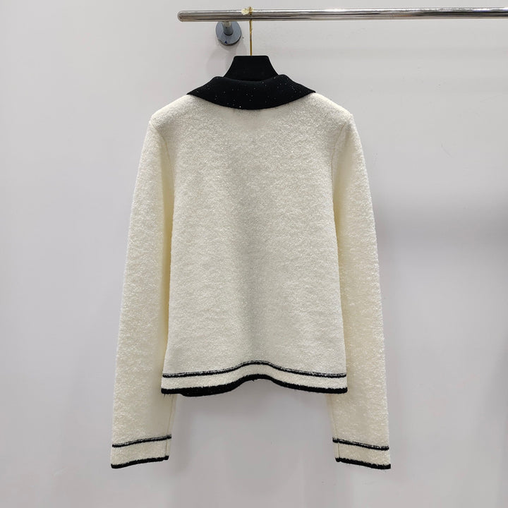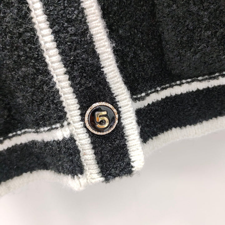 Exquisito temperamento, cuello de camisa con hilo de lentejuelas + hilo de bucle grueso, cálido y esponjoso. Botones dorados de 5 dígitos, atuendo antiedad y de moda.