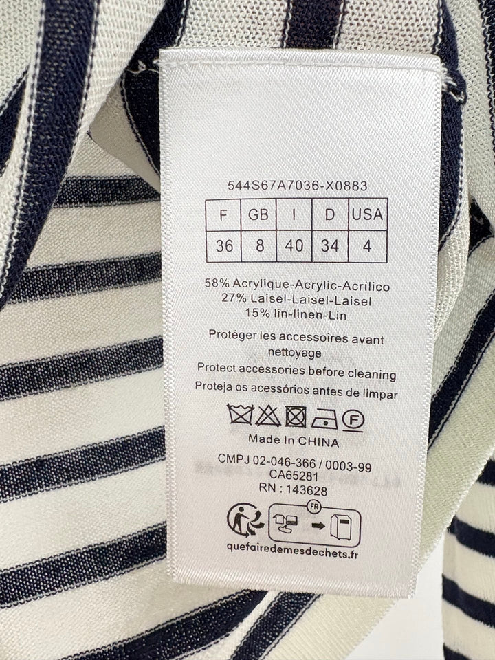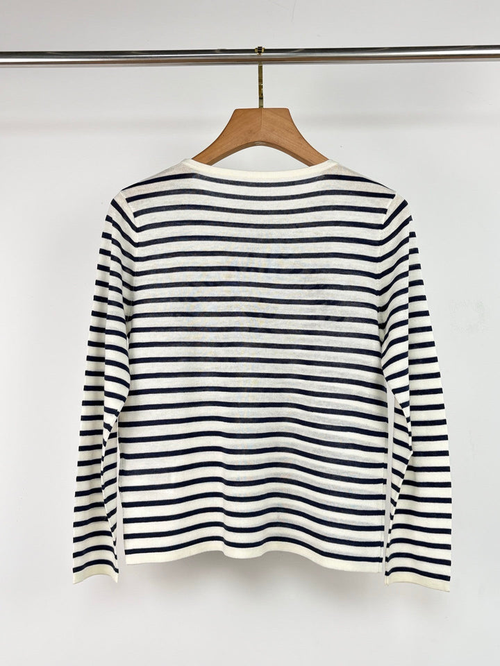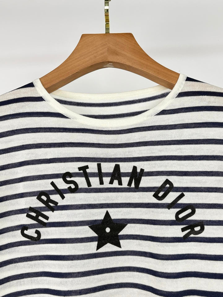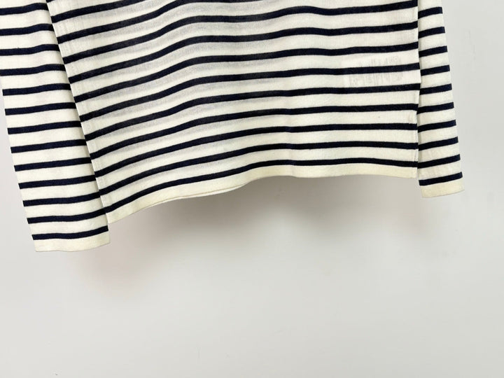 La camiseta de manga corta con cuello redondo y rayas en contraste le da al conjunto un estilo francés informal y relajado. El logo de la marca está bordado en el pecho. El diseño de rayas antiedad incluye una versión elástica fina. Disponible ahora.