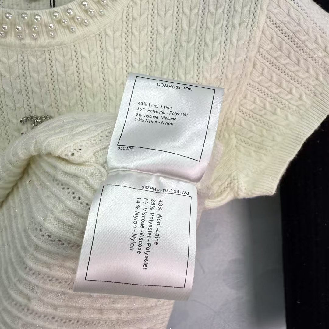 Custom-made YB wool yarn weaving, elastic and comfortable, with a rich texture. Short-sleeved top cut to highlight the brand's style. Made of wool with elasticity, creating a slimming visual effect. The entire garment features a delicate vertical cable knit texture. The collar is adorned with pearl-sewn beads, complemented by double C-shaped rhinestones on the chest for rich details. The design highlights transform a simple basic style into a fashionable piece. Silver thread integrated, exuding a sophisticated aesthetic. Whether worn alone or layered, it stands out as a stylish piece. Available in 3 colors.