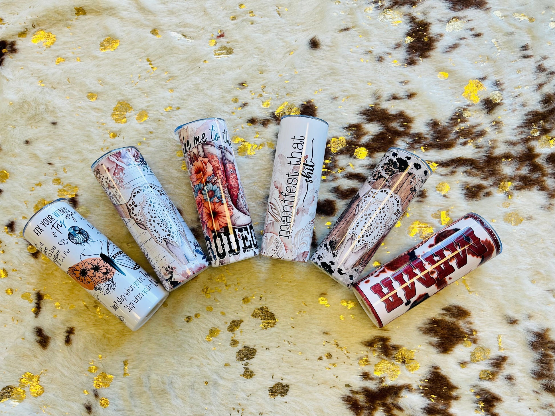 20oz double wall insulated tumblers. Several beautiful designs to choose from. Comes with open/close top and straw.