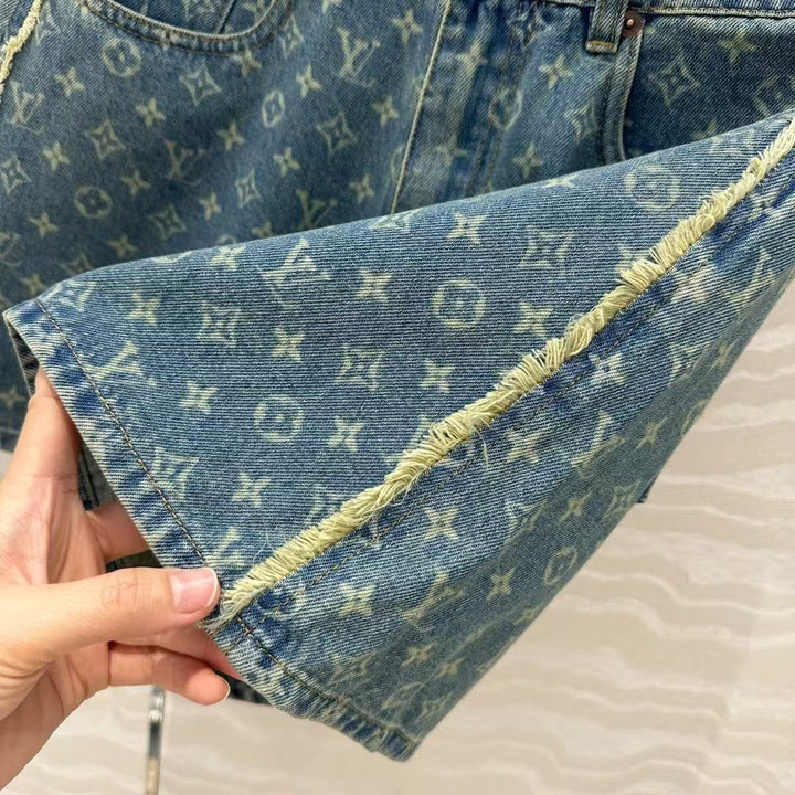 Jacquard denim shorts! Embroidered gold label retro washed blue denim hair edge craftsmanship! Imported denim with full bones and customized active washing craftsmanship, it's awesome! Classic high waist A-line style, versatile and fashionable! It makes you look slim! Imported washed denim fabric has a strong and stylish texture!