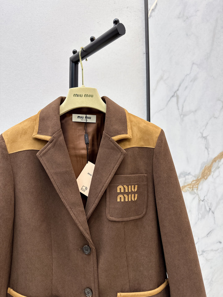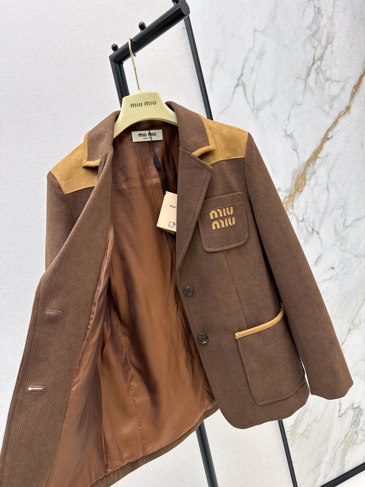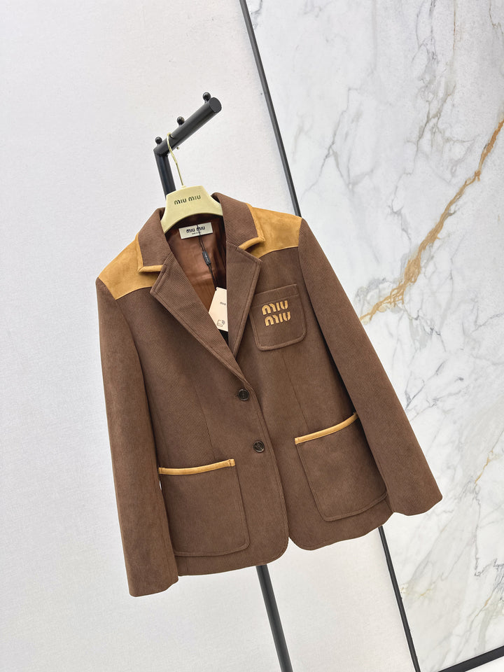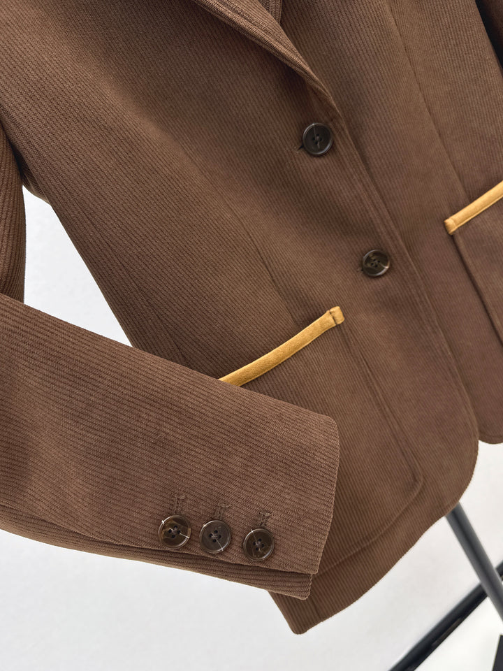 Corduroy material texture is high-end, comfortable, and crisp, with a lapel collar suit jacket. The finished garment is designed with a dark brown vertical pit strip that exudes a strong sense of money. The collision design is rich in details, making it more fashionable. The pockets are sewn with letters and logos, highlighting the style. The back waist slit outlines the curve, making it slimmer. The regular straight tube version is elegant and retro on the upper body. It can be paired with any outfit, making it free spirited and handsome.
