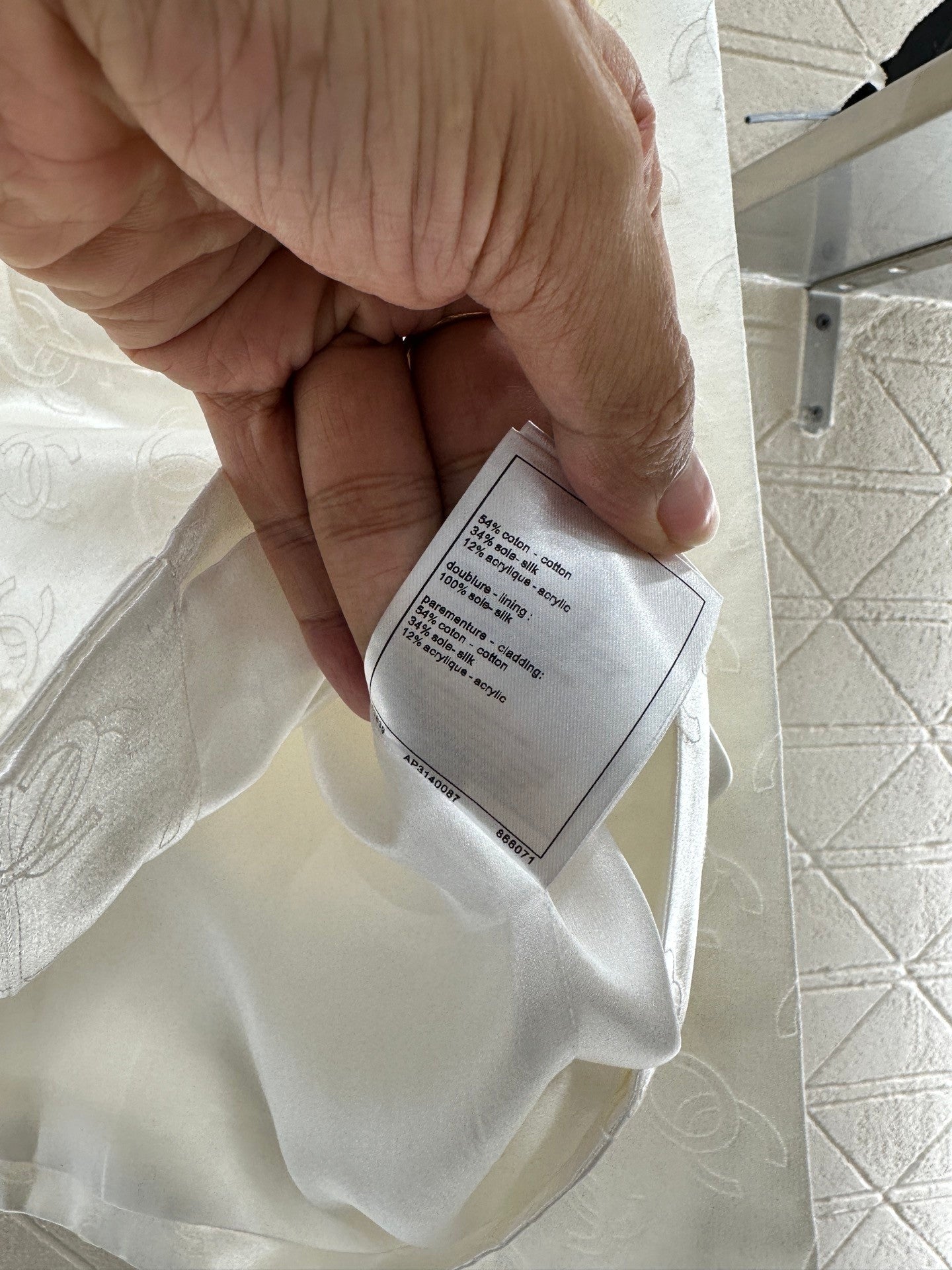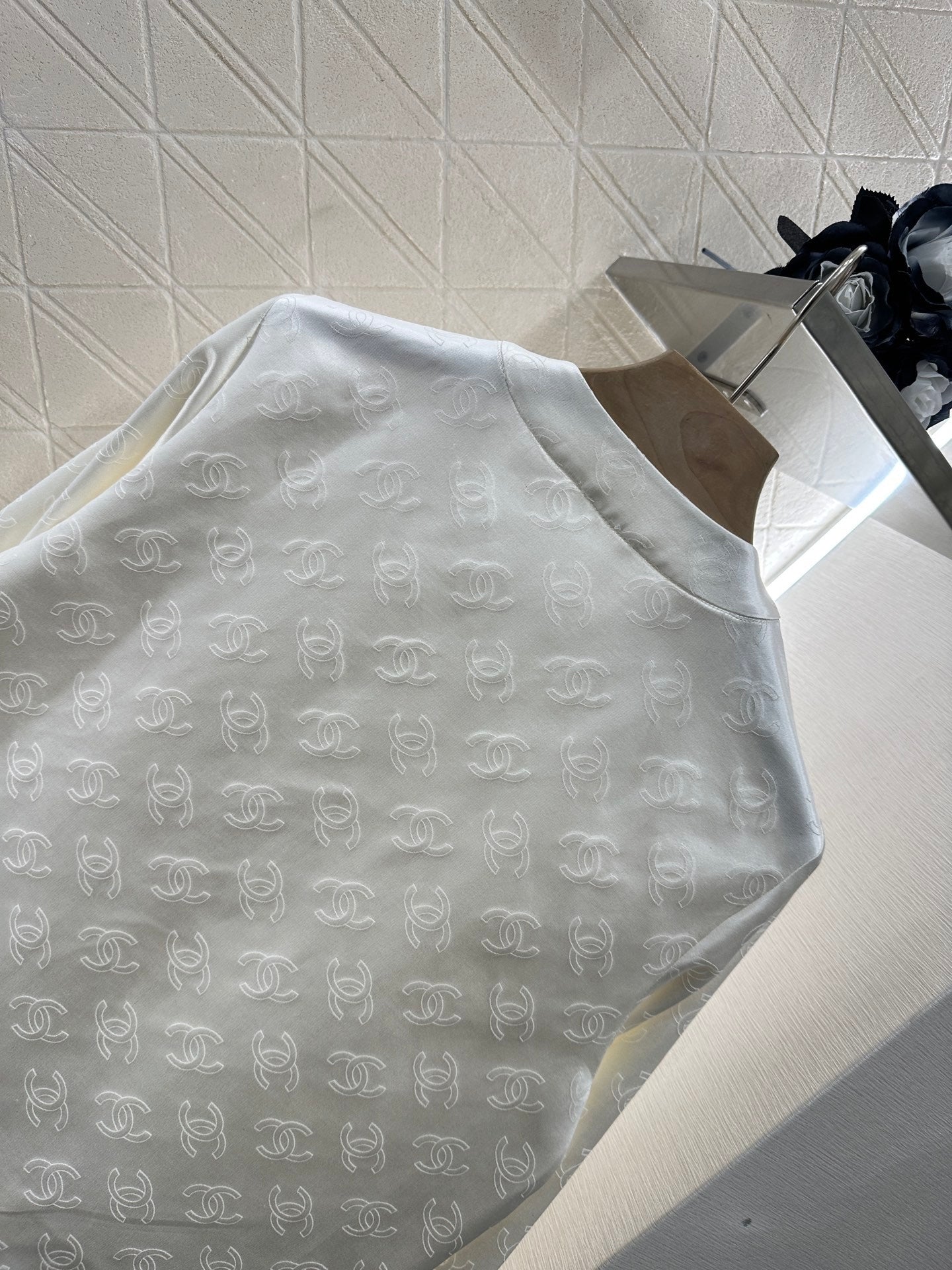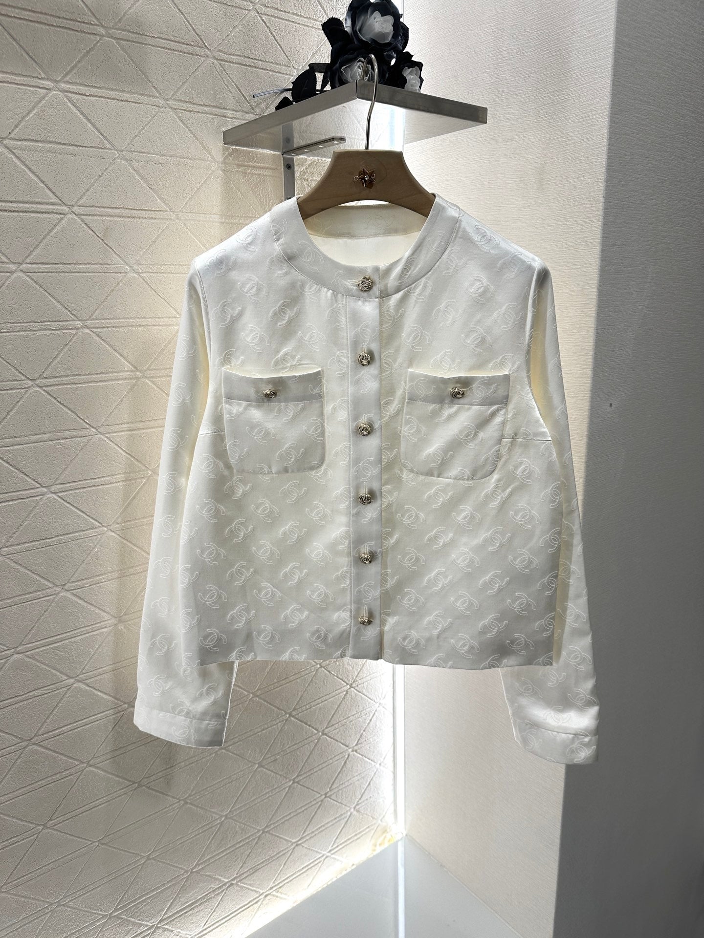 Silk-cotton jacquard fabric with a luxurious texture, smooth and skin-friendly, structured and well-defined. A tailored shirt jacket with a rounded collar and straight shoulders. The entire garment features a full jacquard pattern of double C letters, setting a minimalist and fashionable tone while highlighting the brand's premium style. The front of the jacket is adorned with a buttoned collar and a bow tie. Symmetrical pockets with rich details, sharp tailoring that flatters the figure, effortlessly exuding high-end elegance. Stylish and graceful, perfect for daily commuting. Custom-made fabric and lining, choose the high-end version.