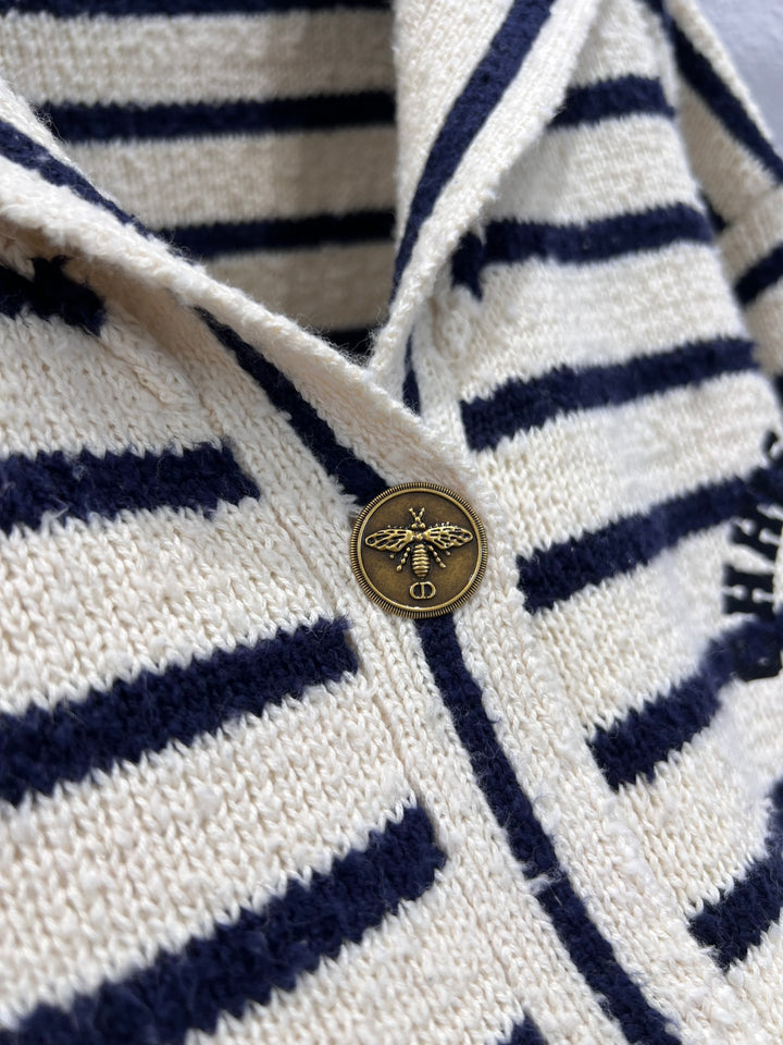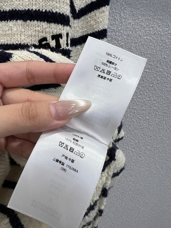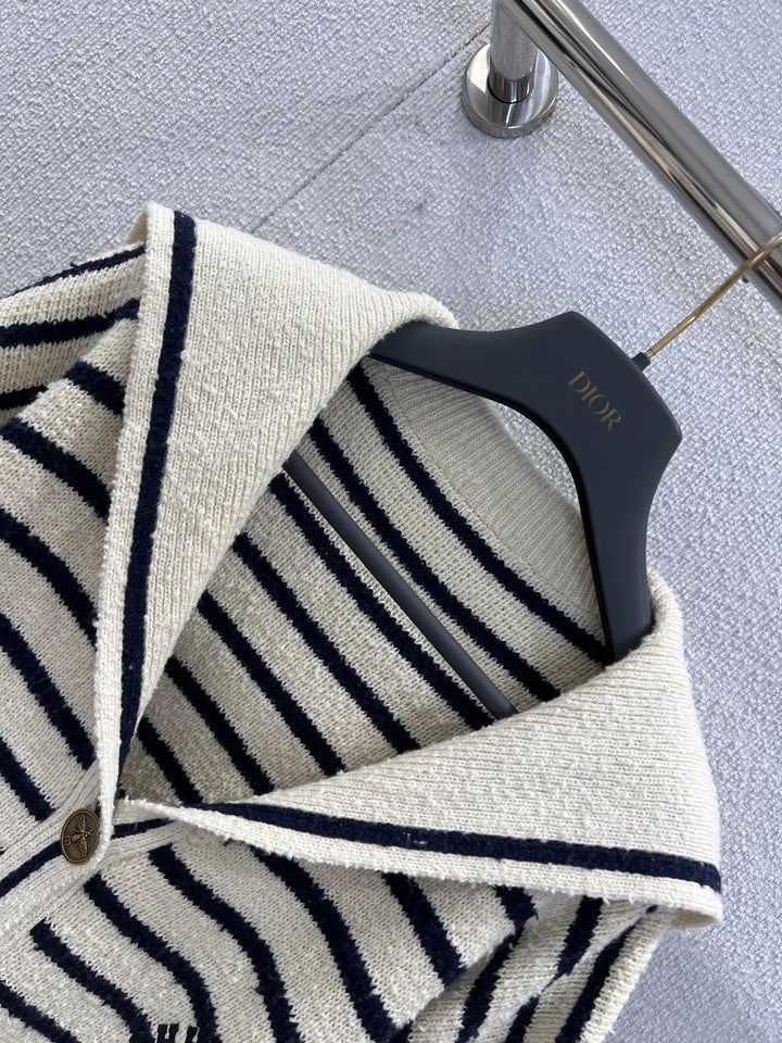The milky white and navy blue contrasting stripes come with a French sense of relaxation, while the large lapel design not only reduces age but also decorates the shoulder and neck lines. The chest features embroidered letters and iconic CD metal buttons, exuding a low-key yet high-end texture. The small square decoration is a surprise of detail control. Micro silhouette and short cut can be paired with high waisted jeans to show off proportion, or with black wide leg pants for a lazy commuting style, suitable for various body types.