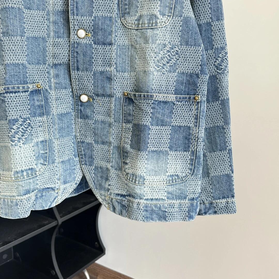Made from 3D Damier jacquard fabric, this denim jacket has a sleek collarless design and buttoned cuffs for a dandy look that pairs well with matching trousers.