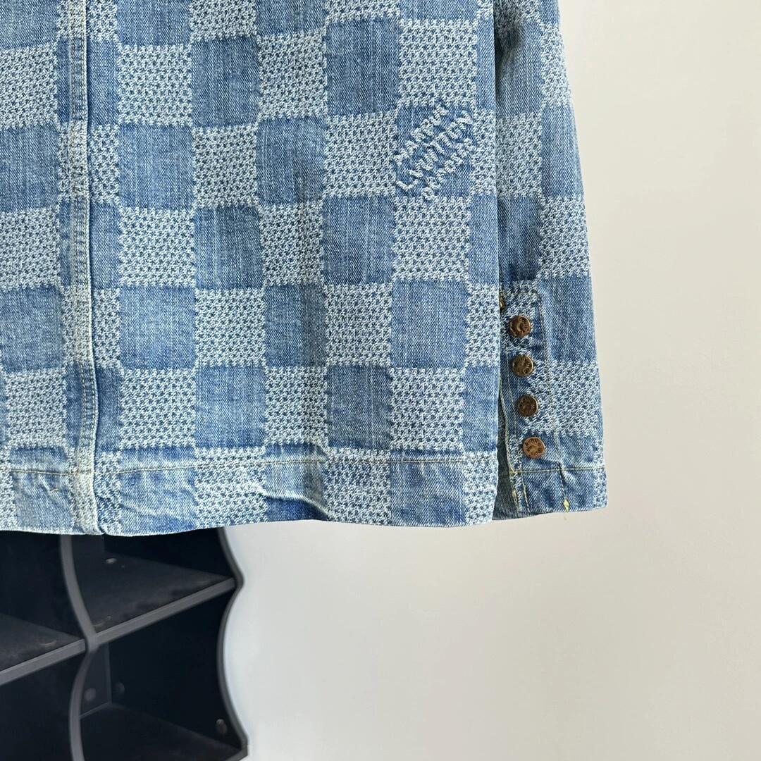 The collarless denim shirt features no traditional collar design and uses buttons as a closure method, creating a relaxed and casual feel. The curved hem denim shirt is a unique design with a curved hem, making the entire shirt more visually dynamic and streamlined.