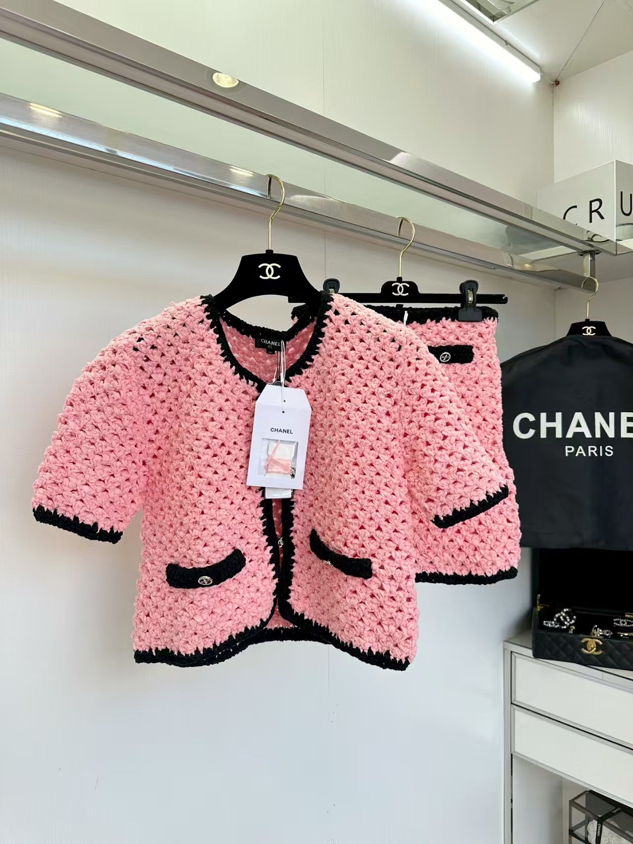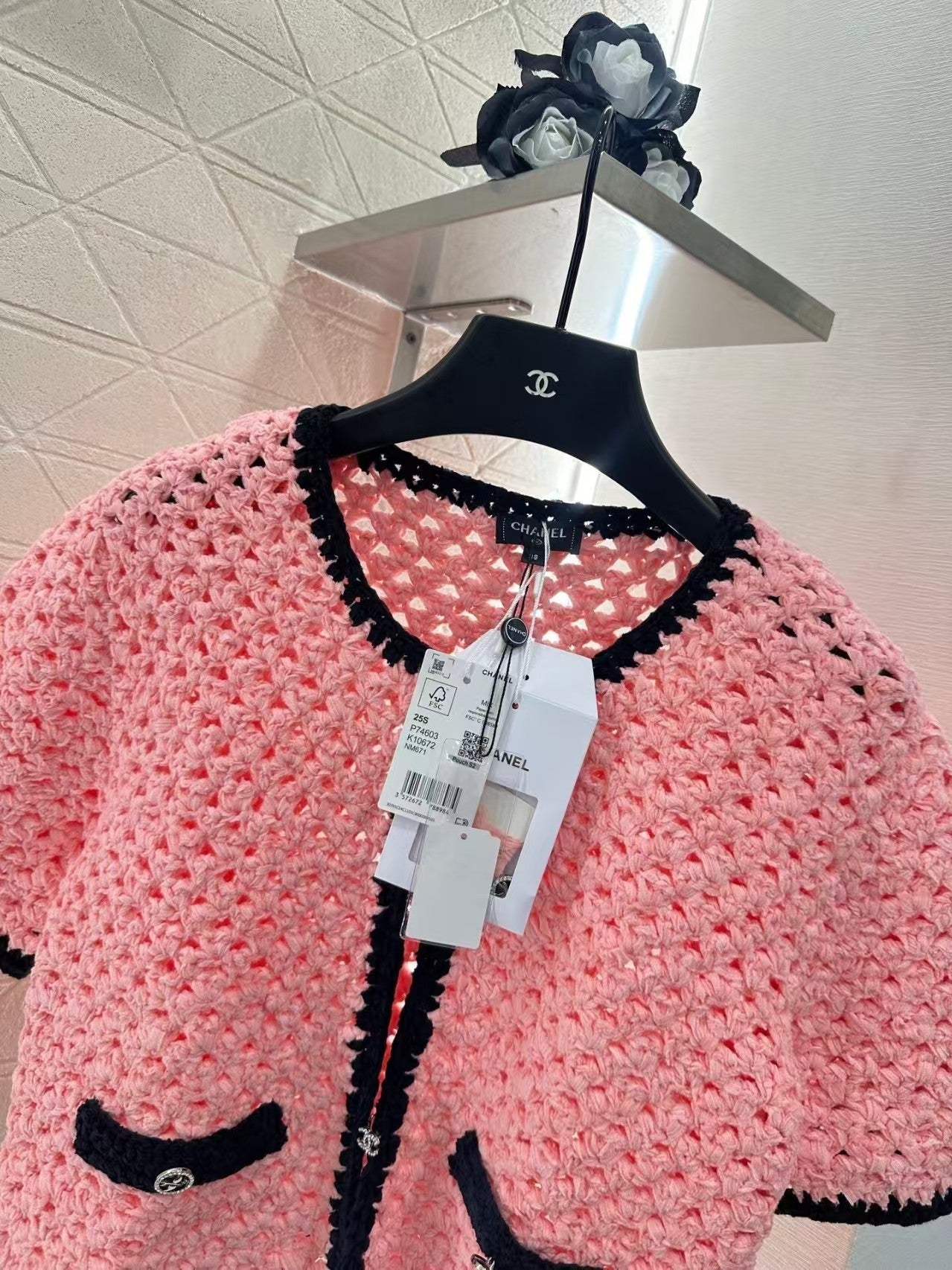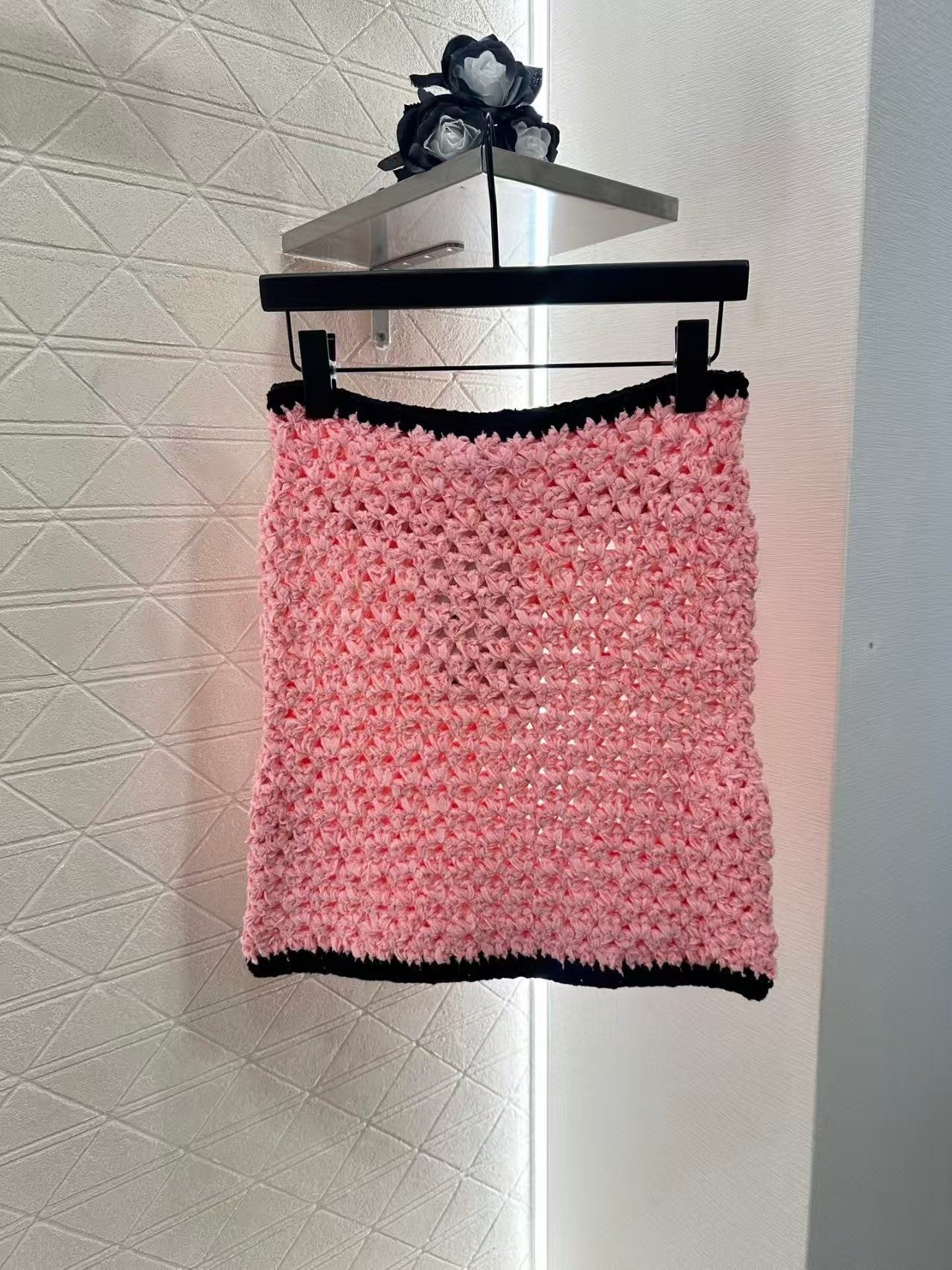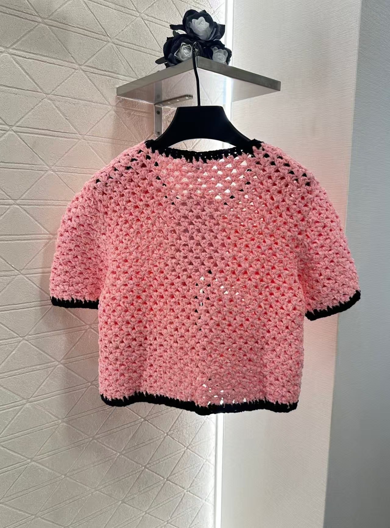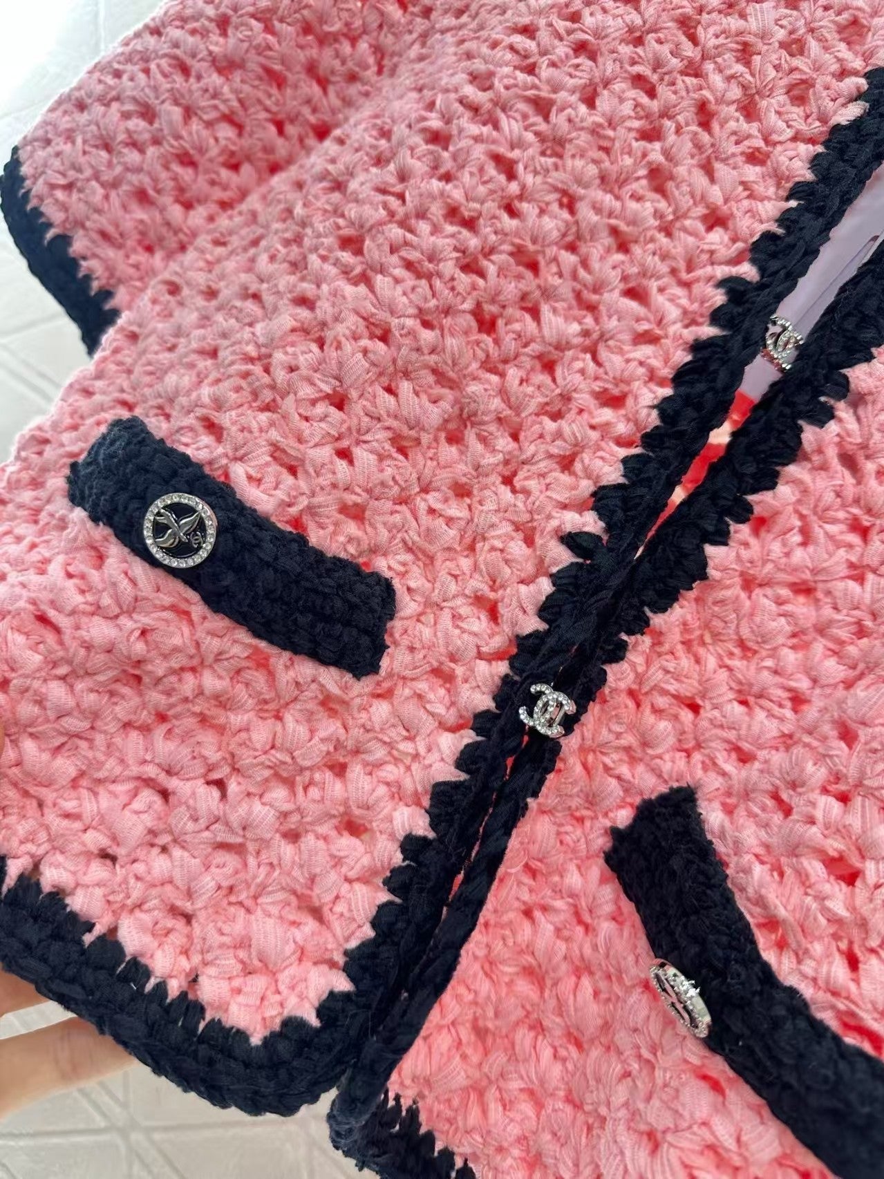 Crafted from custom YB cotton and wool yarn, this dress is comfortable, soft, and delicate. This knitted dress-style short-sleeved dress features openwork crocheted details throughout. The hems and pocket edges feature contrasting black thread, accented with delicate round buckles. This dress has a strong retro style and a playful, youthful, and youthful look. The placket is adorned with a double-C rhinestone buckle, highlighting the brand's signature style. Paired with a matching straight skirt, this dress is fitted and slim-fitting, with a loose fit at the top and a tight fit at the bottom, showcasing a refined, retro feel. Perfect for dating or commuting.