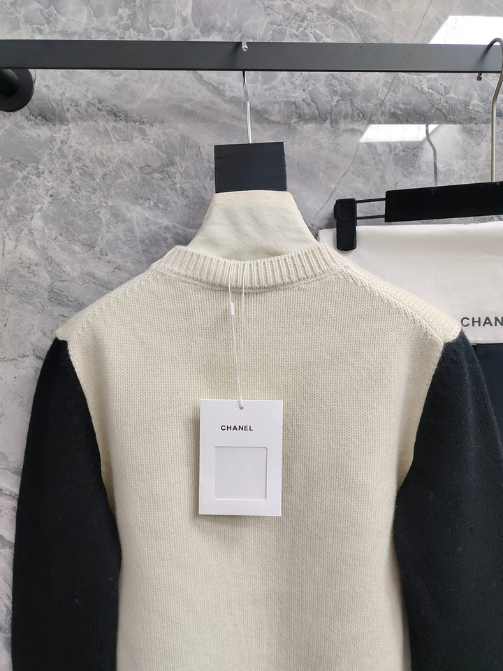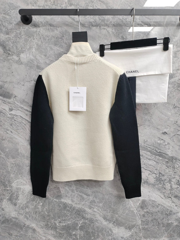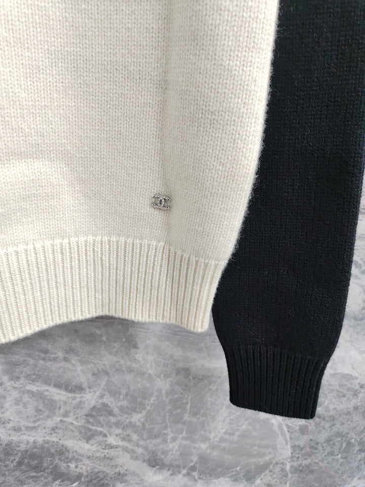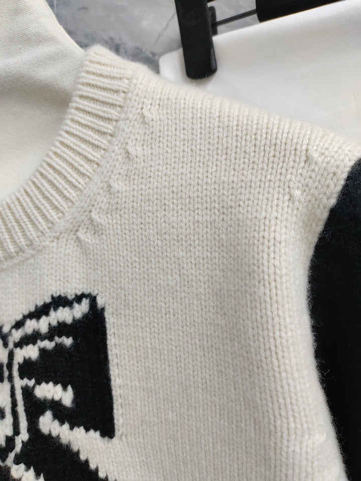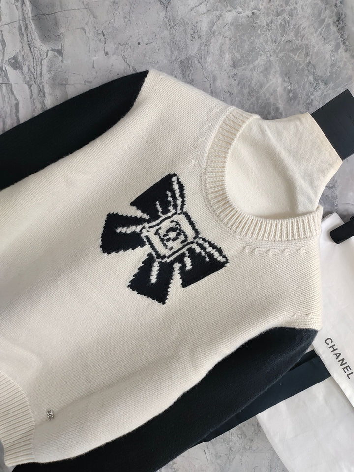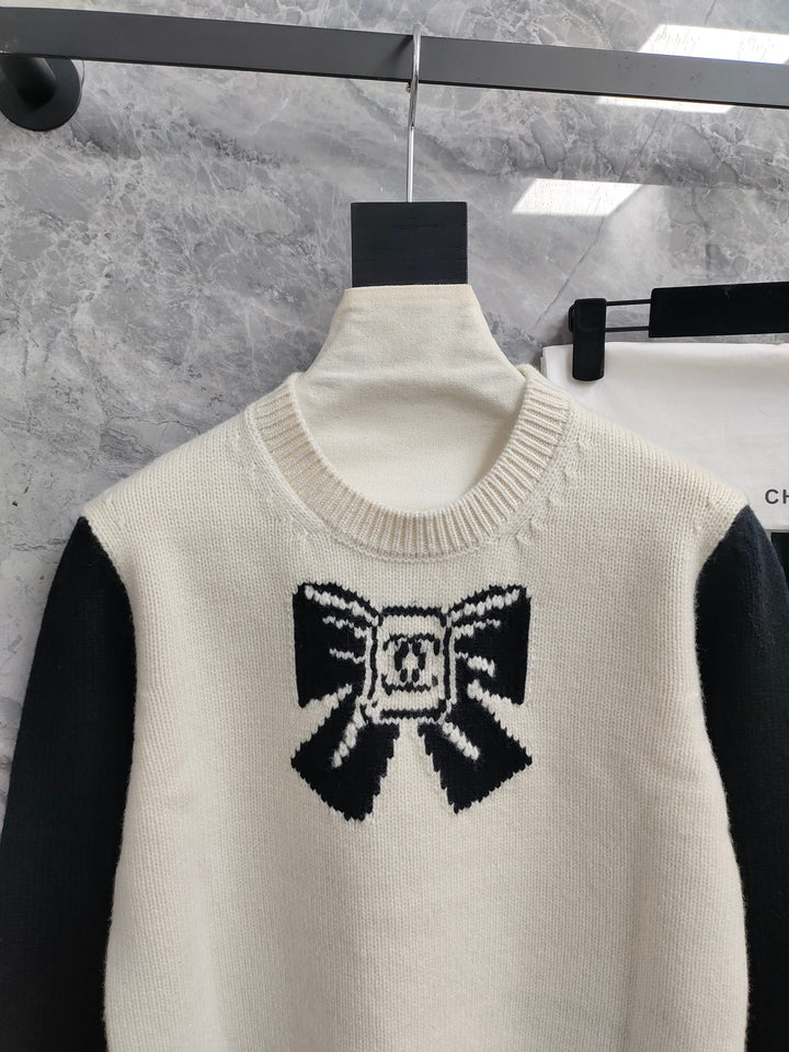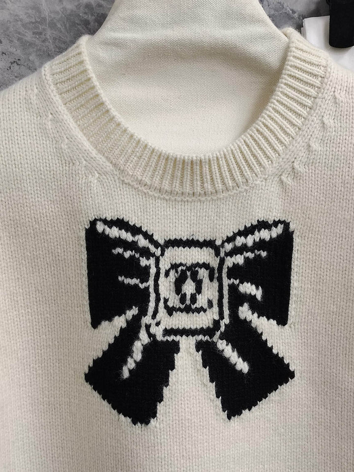 Selected soft knitted fabric, balancing skin friendly texture and warmth in autumn and winter. The center of the garment features a three-dimensional bow pattern woven in black and white contrasting colors, with a classic logo embedded in the center. The beige tone is paired with black long sleeved stitching, and the round neck and slightly loose fit are suitable for a variety of body shapes, with a relaxed yet delicate tone!