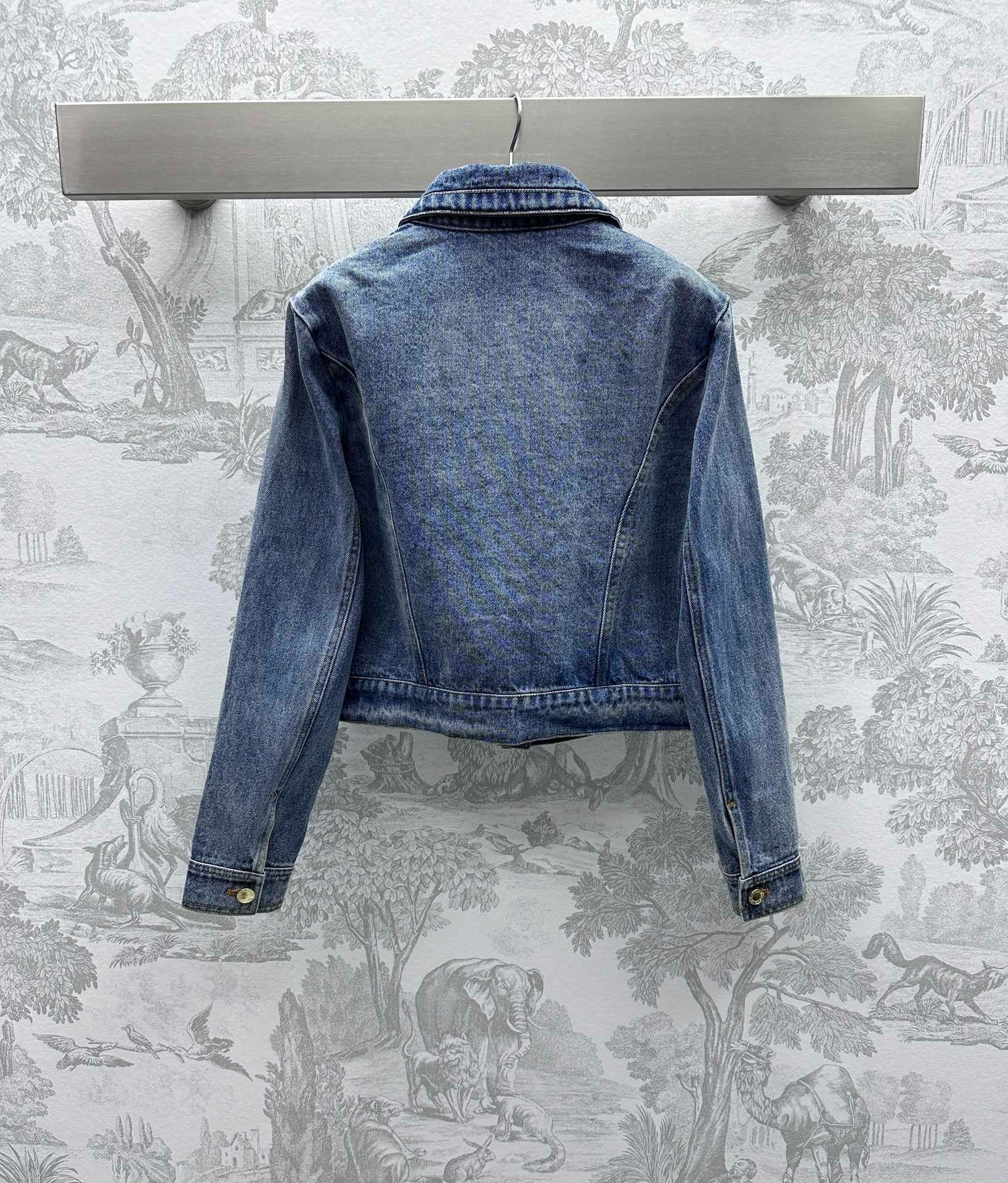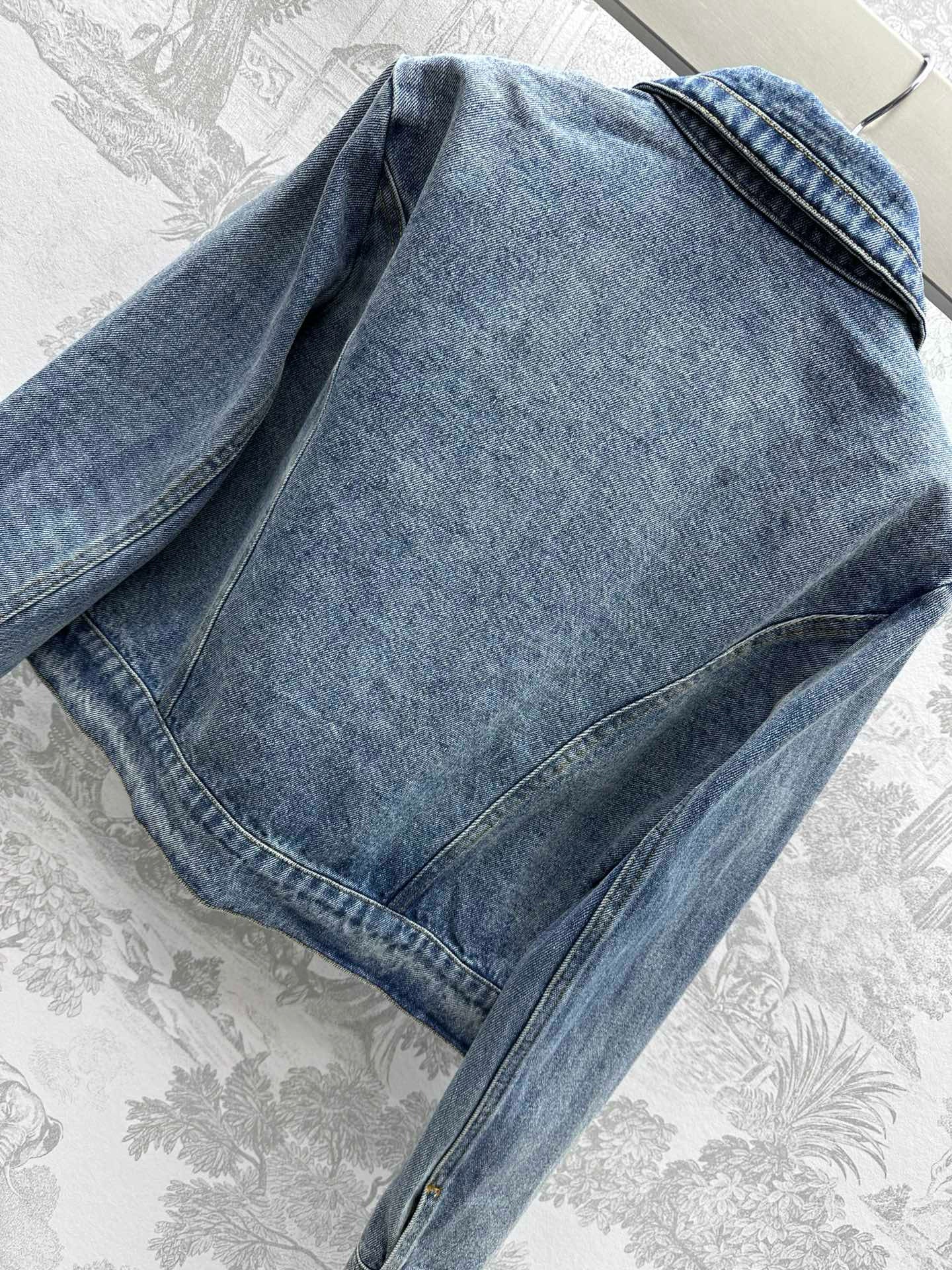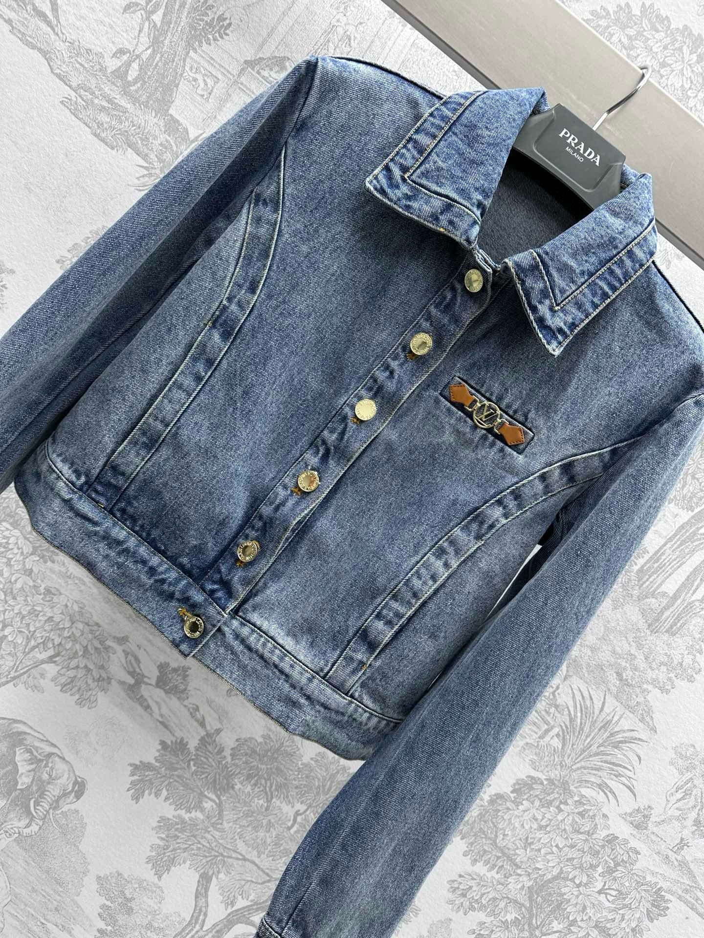 Lapel long-sleeve denim jacket with metal logo leather buckle on chest