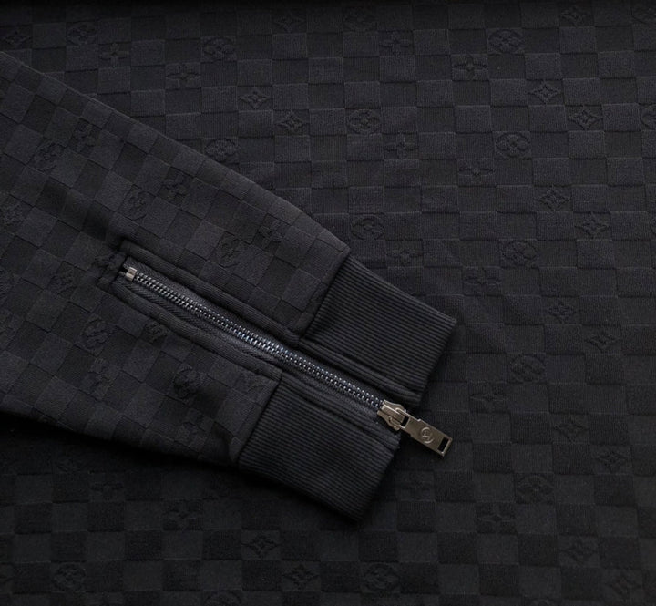 Dark grain fabric, ribbed stitching neckline and hem, zipper design at cuffs, custom hardware accessories! The upper body is stiff and stylish, and it is tolerant!