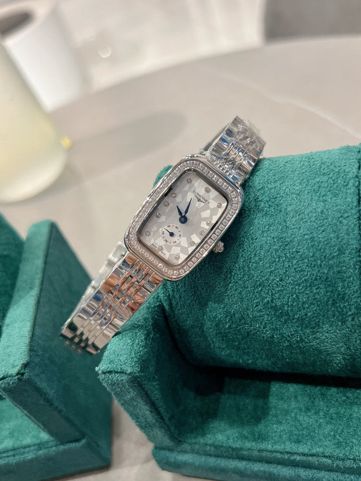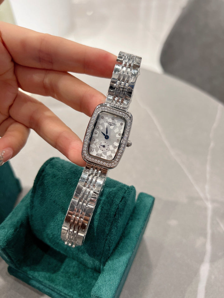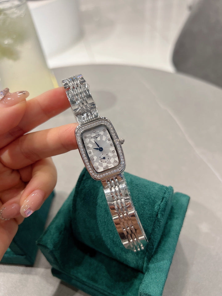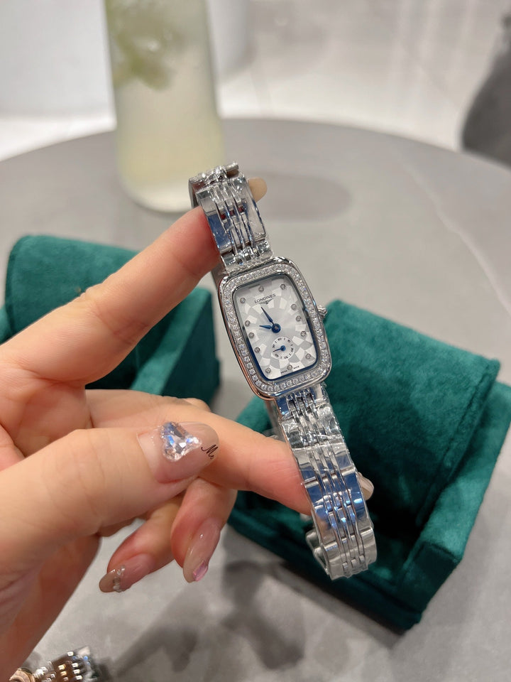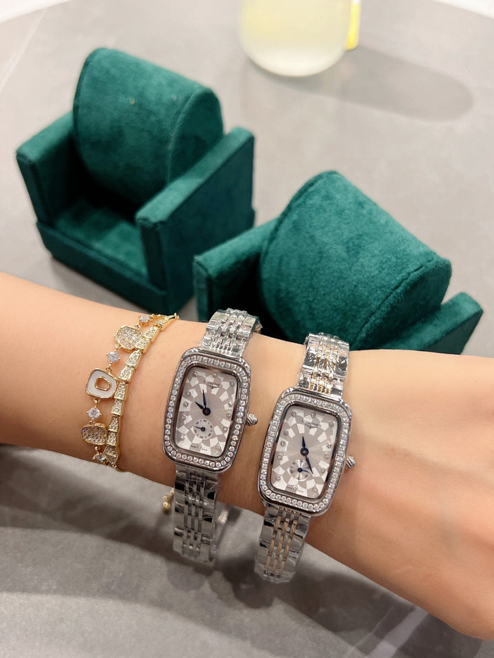 The compact watch has the characteristics of a square shape, with rounded corners instead of sharp square corners. The original rosette handle and patterned stainless steel hands are very elegant! It works great! It adopts imported quartz movement, crystal-clear texture of diamonds inlaid on the ring, classic Roman face, Arabic numeral face, and double bridge-shaped glass.