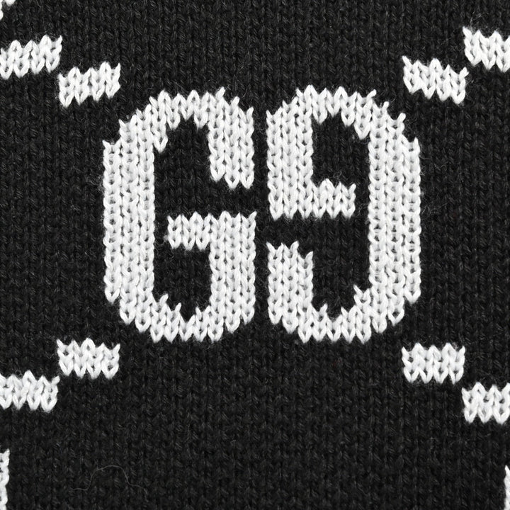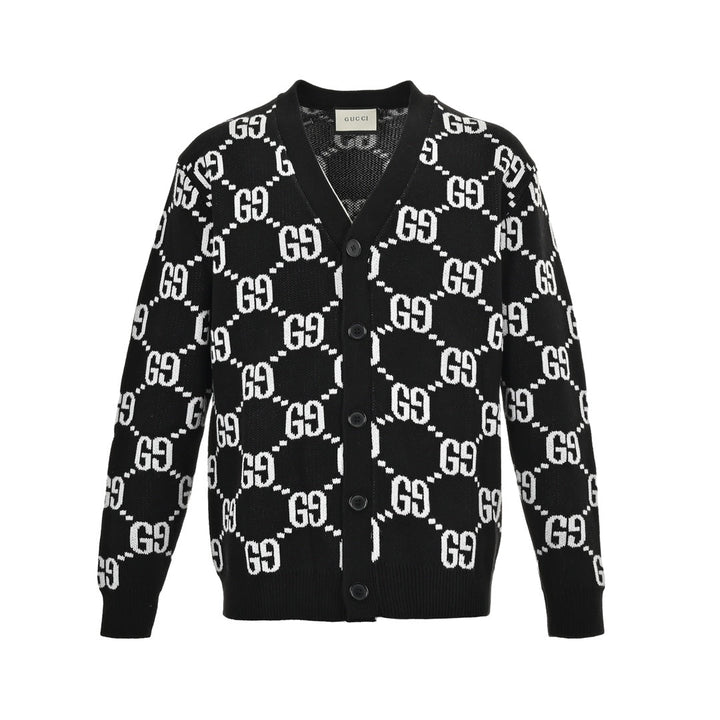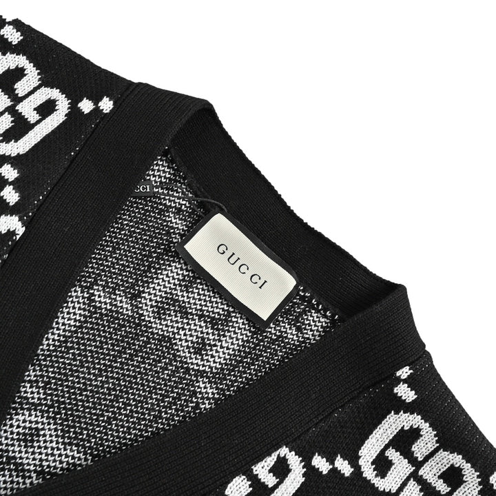 Black and white double G letter printed knitted wool cardigan. Knitted with 2/40 100% cotton. The yarn color is dyed to the original version. After customizing the yarn, it is all twisted and then spliced to achieve the twist and stiffness of the original version. Full-width double G jacquard