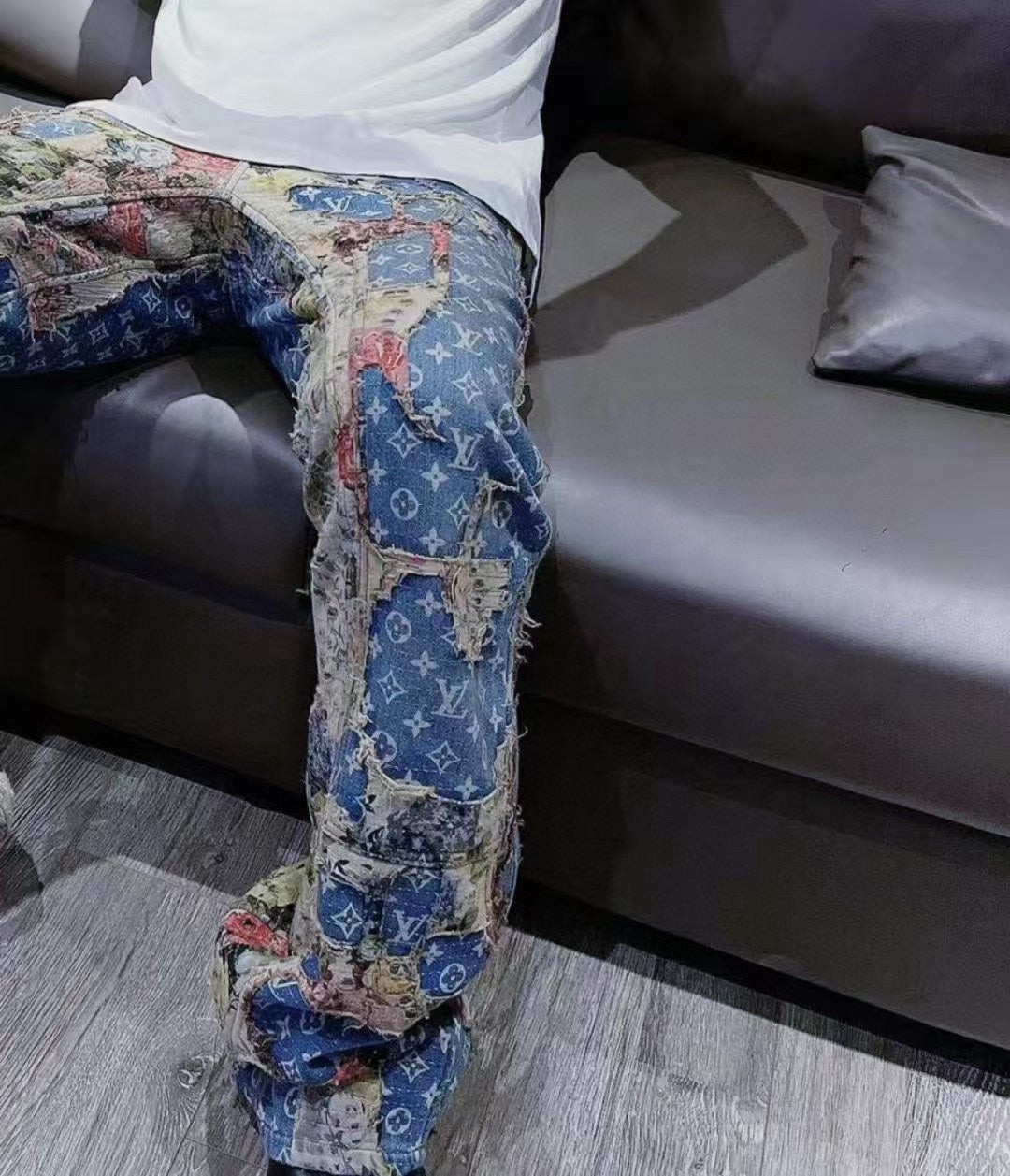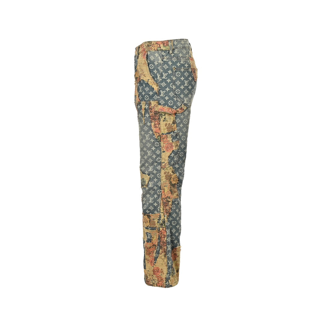 The exclusive custom woven all-over print type base fabric is complemented by a digitally printed floral top fabric. The quilting machine has been used to create a quilted stitching pattern that demonstrates a high degree of craftsmanship. The heavy duty washed aged finish allows for fading and destructive effects. Embellished with floral elements, these two pieces are infused with a strong vintage vibe, perfectly showcasing the collision of fashion and personality. Floral patchwork vintage jeans for men and women. Relaxed fit with delicate patchwork appliqué craftsmanship, which includes an ultra-intricate laser burnout appliqué with exclusive customised floral appliqué. These trousers present a gorgeous and unique floral pattern through the imported Tajima embroidery process, which requires 200,000 stitches of meticulous embroidery per piece. Diamond-shaped inter-cotton checkered design, high degree of counterpoint to the line process, as well as heavy-duty wash carving broken position precise cut delicate. Unisex
