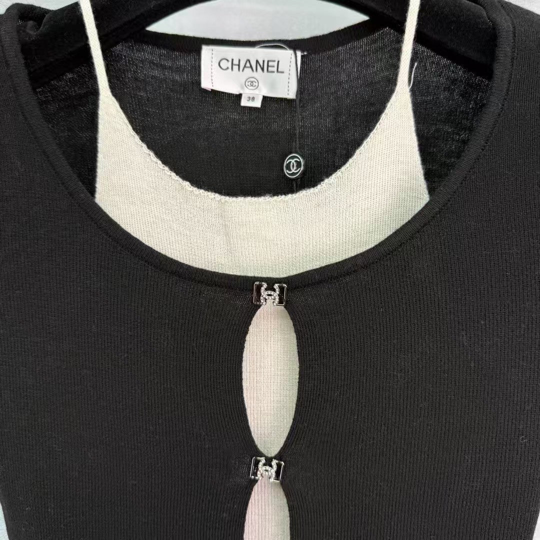 Fake two-piece hollow knitted short sleeves are made of custom YB wool yarn. The texture is high-end and comfortable. The round neck knitted short-sleeved top is tailored. The inner thin camisole is the base layer + the outer short-sleeved front is decorated with porous hollow double Cs. The cuffs and hems are outlined with lace. The fake two-piece with a sense of millennial high street is more elegant with contrasting colors inside and outside. Double C rhinestone buckle decoration highlights the brand personality and highlights the high-end sense of wear. Elasticity makes it more exquisite. Wearing makes you look thinner and shows a relaxed tone. Light luxury and fashionable temperament. It can be worn alone or layered. The first choice for fashionable wear in all seasons