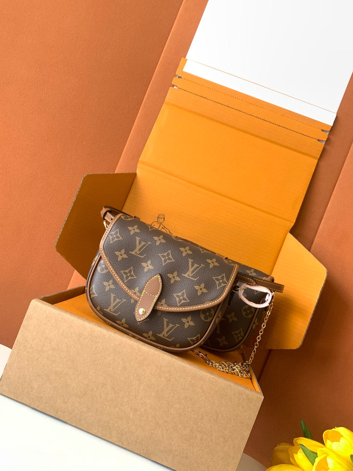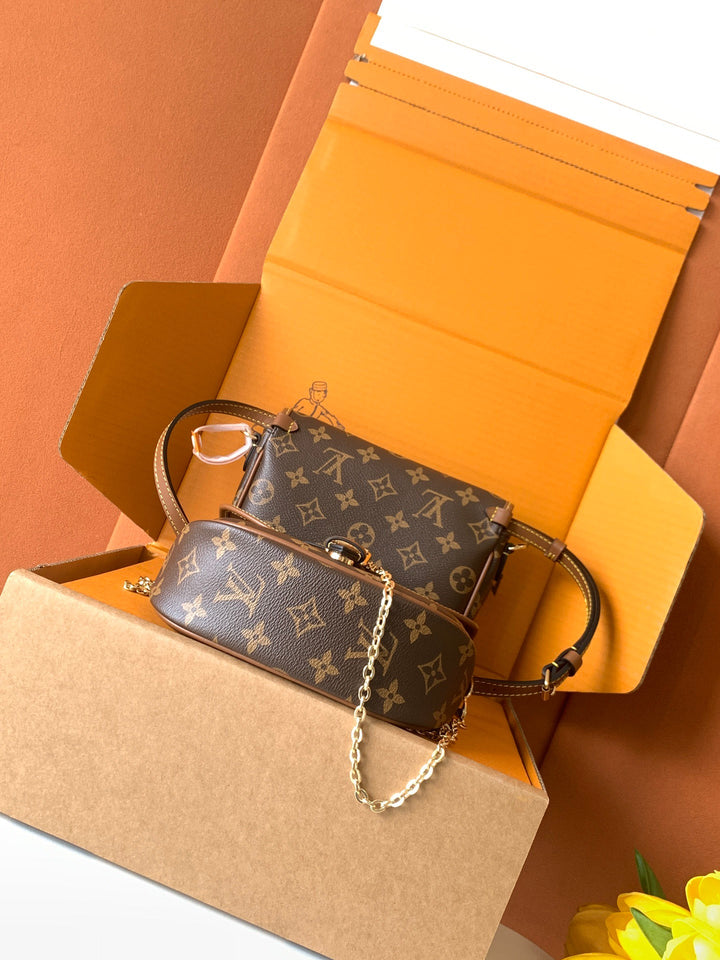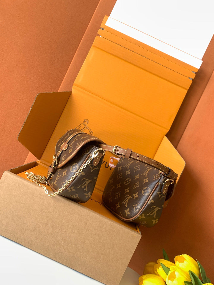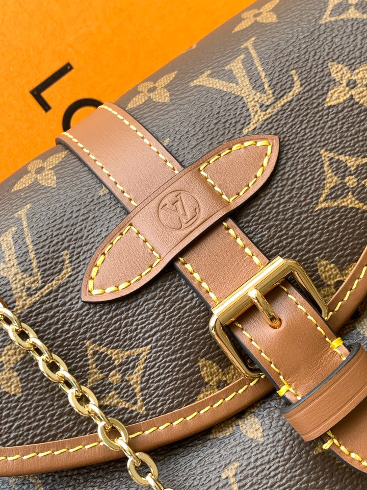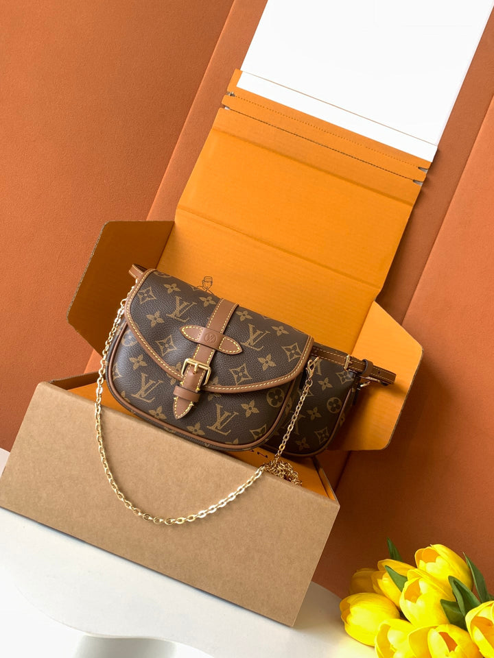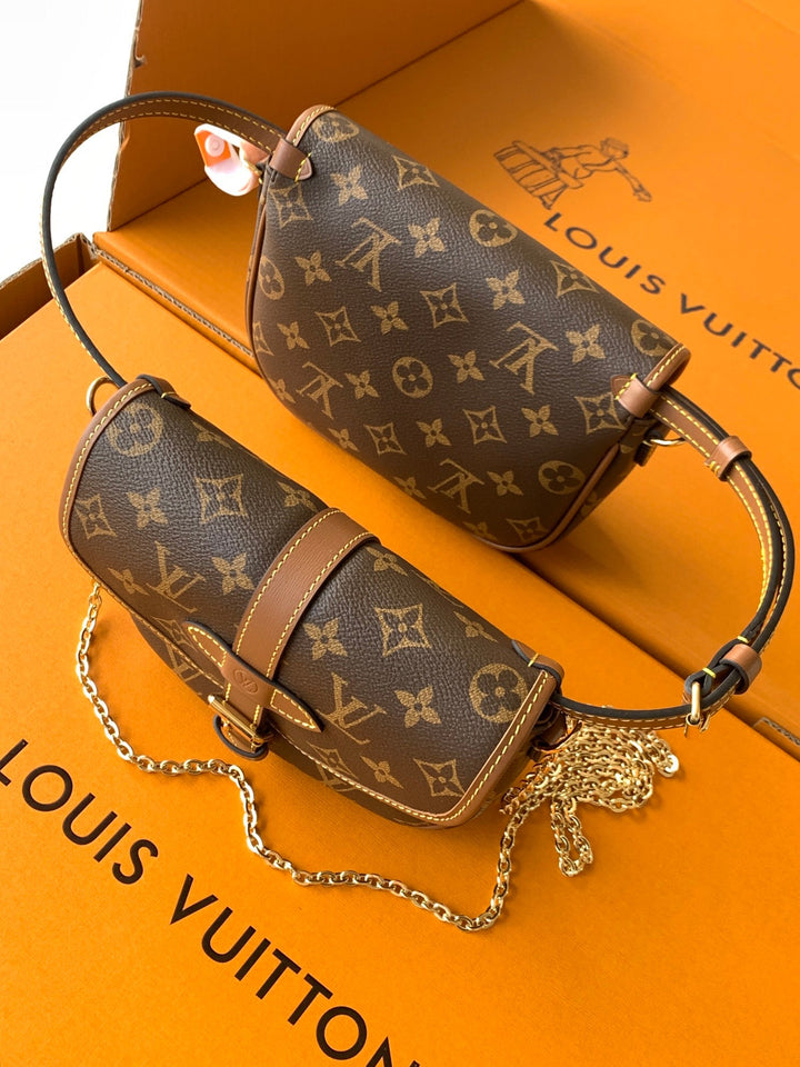 New autumn/winter 2025 collection. Integrating chic design with modern style with a refreshed silhouette. This playful reinterpretation of the classic design of the Saumur handbag features the brand's iconic Monogram canvas with contrasting leather trim and adjustable shoulder straps. It can be worn around the waist, with two compartments on either side of the crotch, or split into two separate handbags. Metal parts add a refined texture.