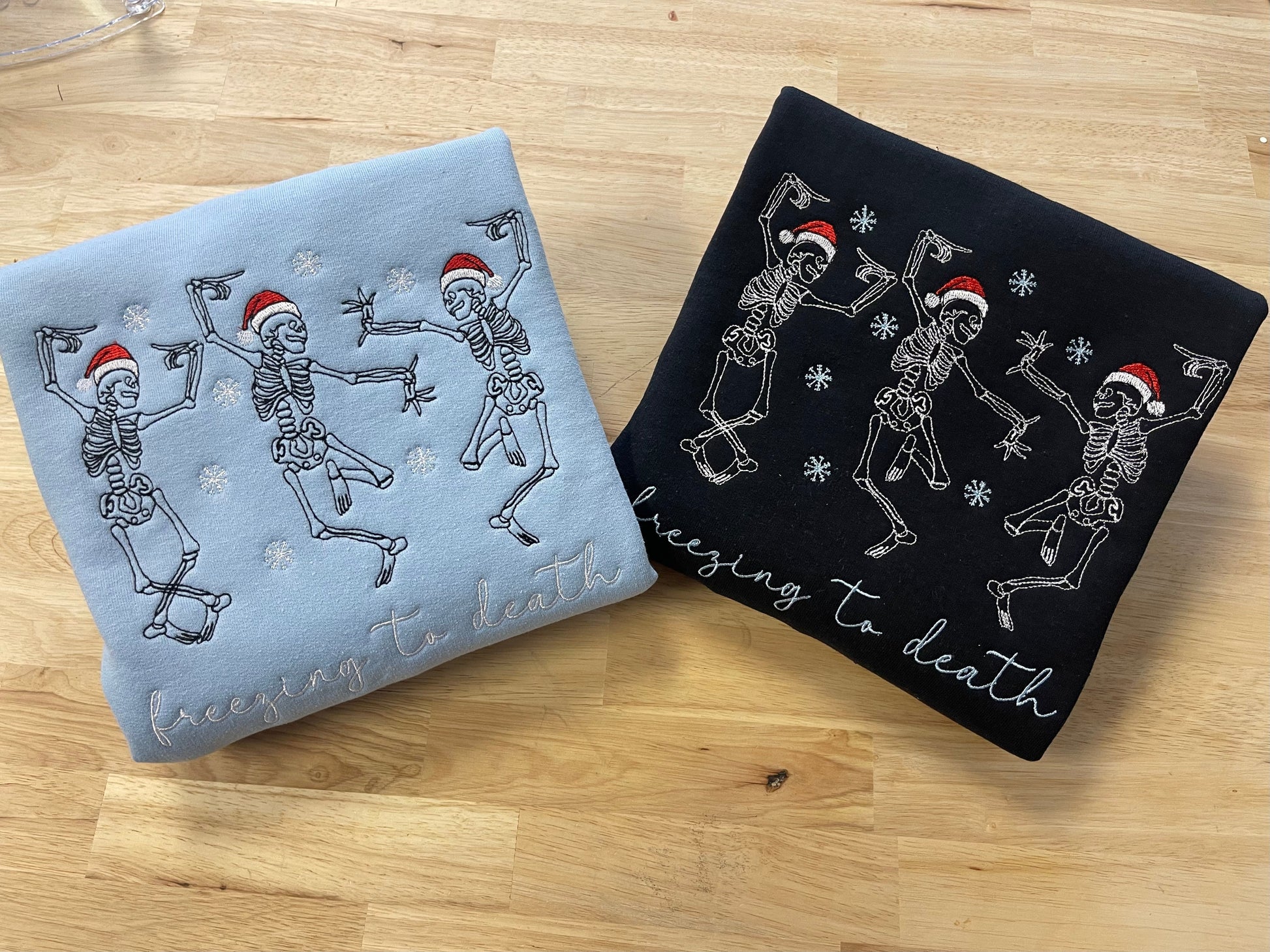 Embroidered skelly crewneck sweatshirt. Funny freezing to death design. Dark sweaters get the light colored domes and light sweater gets the dark bones. Unisex sizes that run true to size 50/50 cotton poly.