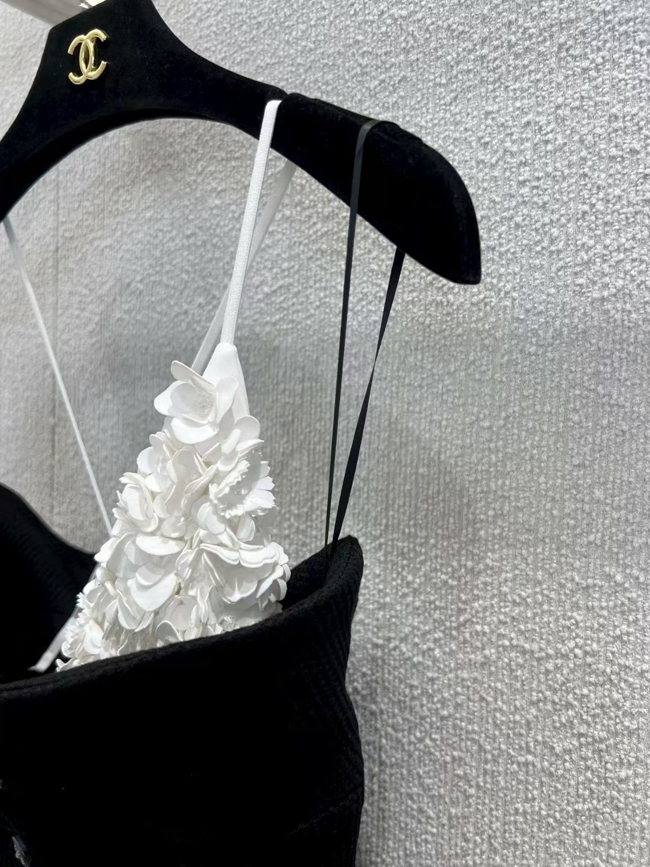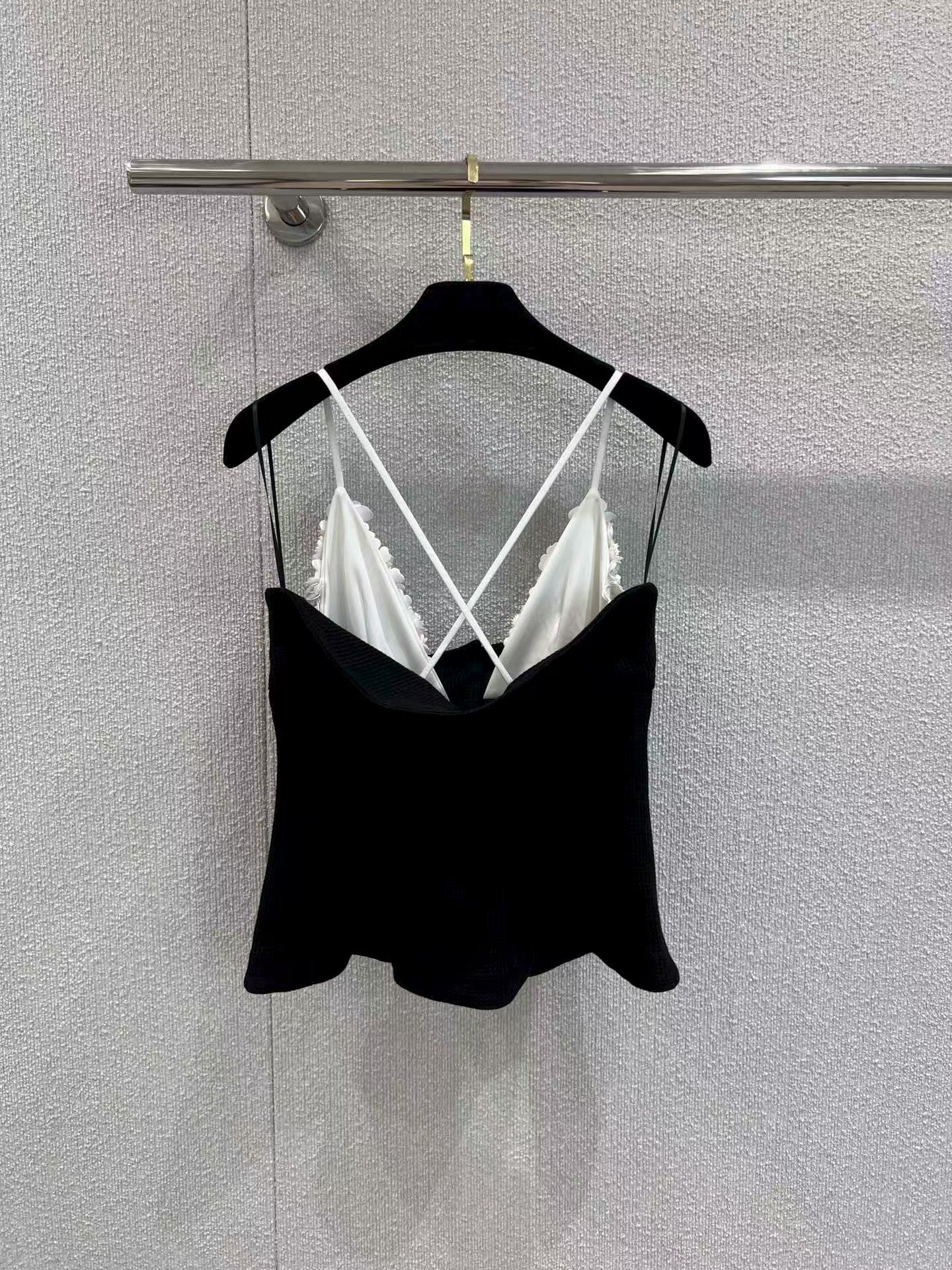 25Ss early spring new style French black and white splicing tube top camisole | Gaoban produced! Made of mixed fiber waffle jacquard fabric, the unique texture gives the fabric a three-dimensional and textured feel, skin-friendly and breathable. The tube top and camisole are innovatively spliced to create a fake two-piece effect. The three-dimensional small flowers with multiple splitting processes at the triangle cup are embellished with transparent crystals, adding a romantic and sweet atmosphere to the whole piece. The combination is very elegant and has a fragrant girlish feel.
