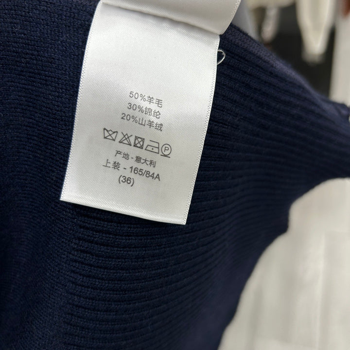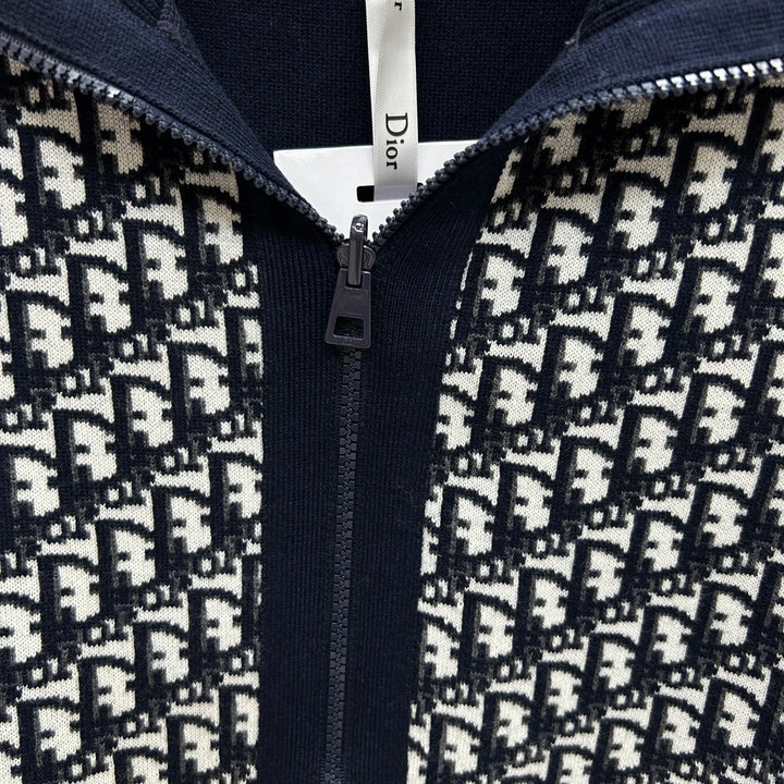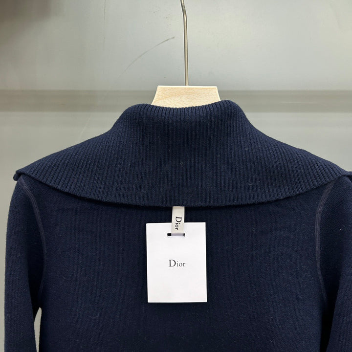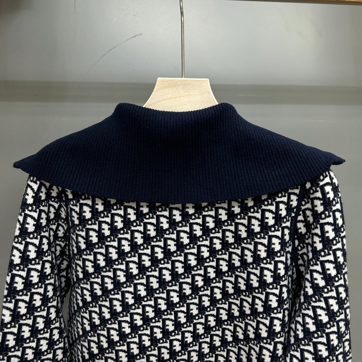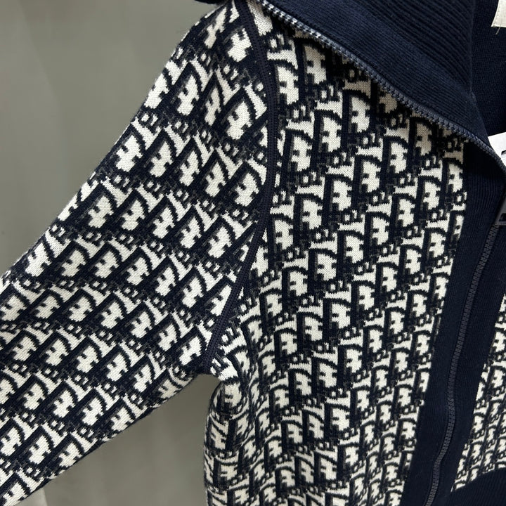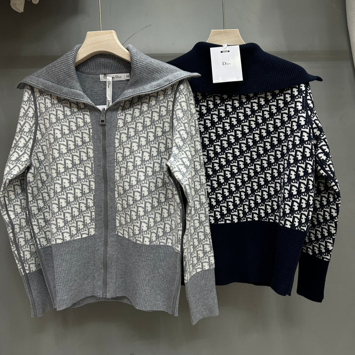 Full of letter jacquard navy collar zipper cardigan
