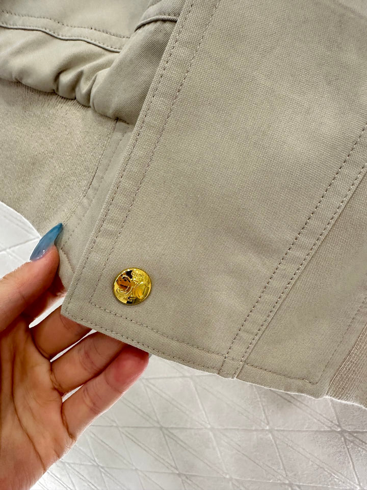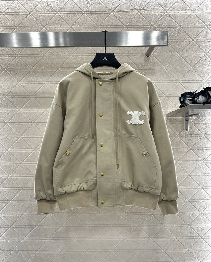 The twill all cotton material has a glossy texture and a full appearance. The cutting is smooth and flowing, and the zipper hooded jacket has a diamond grid cotton treatment on the inside. The elastic thread at the hem increases the warmth of the outfit. The Triumphal Arch logo decoration on the chest lights up the details, and the loose silhouette is inclusive and fashionable. It is the first choice for autumn and winter outerwear.